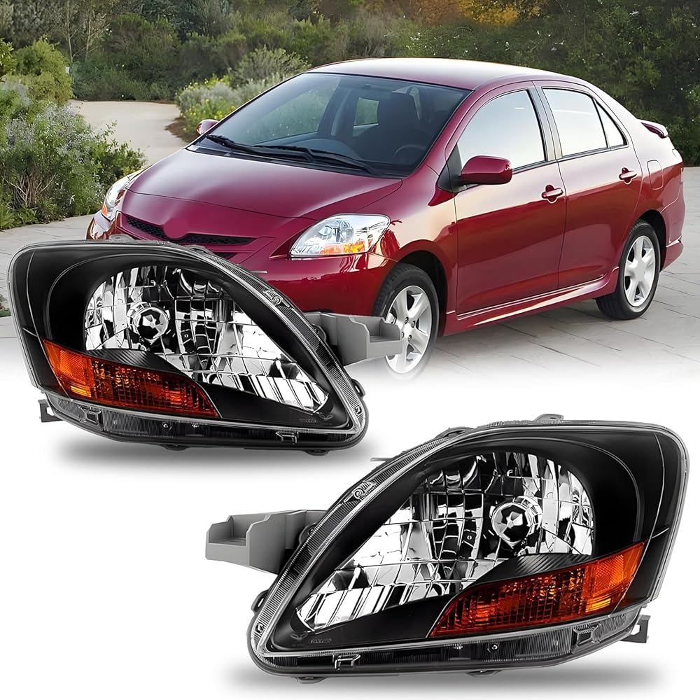 2PCS Headlights Assembly Compatible with 2007 2008 2009 2010 2011 Toyota Yaris Base S 4-Door Sedan Headlamps Assembly Black Chrome Housing Replacement Driver & Passenger Side