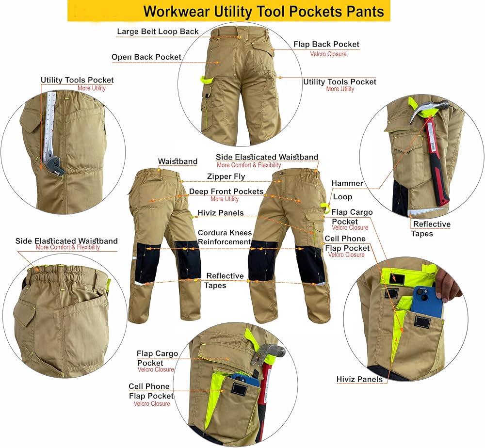 These high-quality work pants are made from strong, durable fabric and feature triple stitching for long-lasting wear. The built-in waist closure and heavy-duty brass ratcheting zipper ensure a secure fit. Designed for functionality, they include a flap cargo pocket, a dedicated cell phone pocket, and an additional tool pocket for extra utility. The side elastic waistband provides added comfort and flexibility, making them perfect for all-day wear on the job.