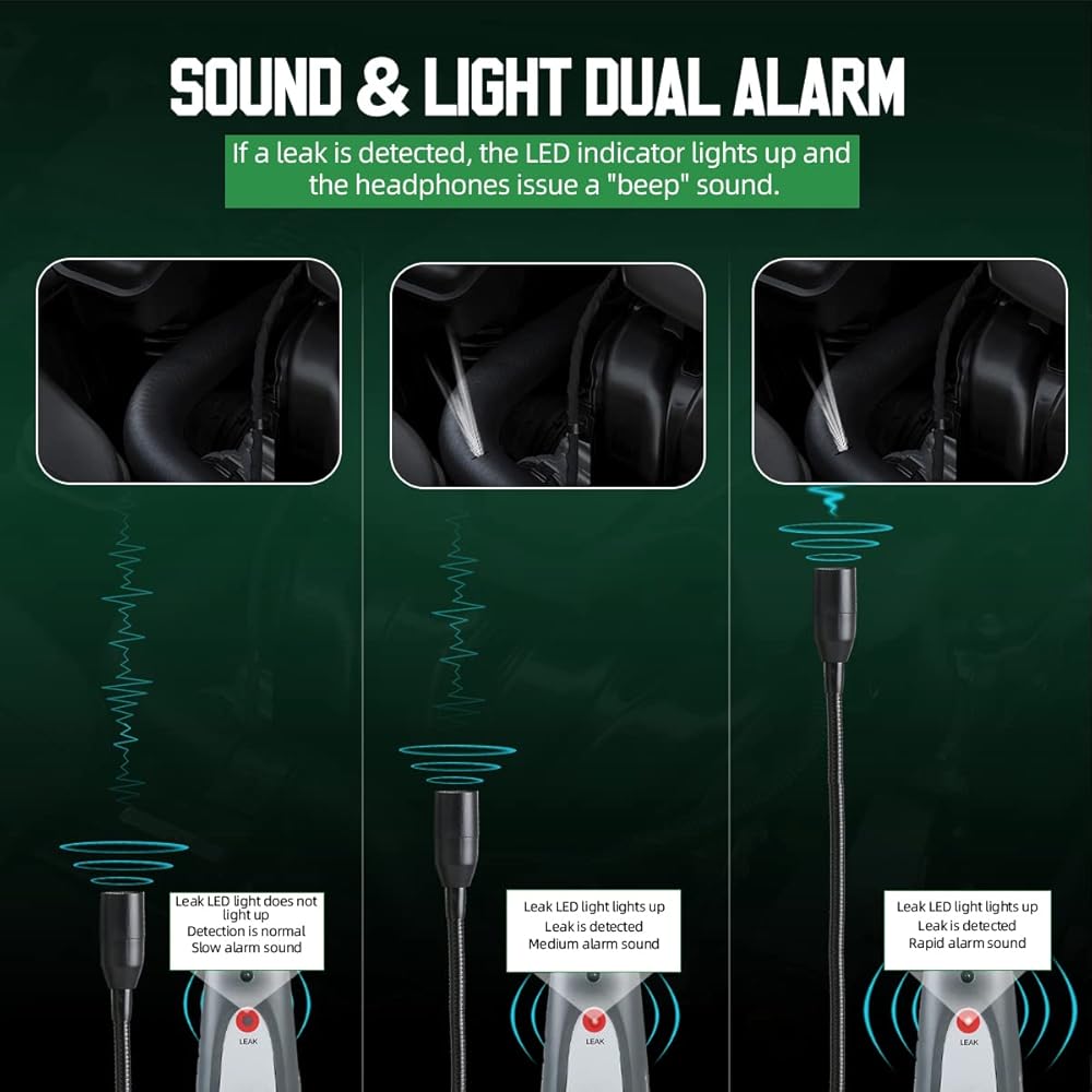[Sound and Light Dual Alarm]: Our ultrasonic leak detector is equipped with headphones and LED indicators. When ultrasonic waves are detected, the ultrasonic leak detector's LED indicator will light up and the ultrasonic leak detector will emit a rapid ticking sound to alert you. By wearing headphones, even the tiniest sounds can be quickly captured. The closer the probe is to the leak, the faster the frequency and higher the pitch of the ticking sound in the headphones. (NOTE: If it is a minor leak, you can identify the leak by wearing headphones and relying on the sound change in the headphones; if it is an obvious leak, the LED indicator on the detector will be light up)