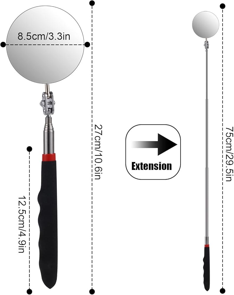 Extendable Handle: Extendable handle help you see hard-to-reach areas. You can adjust the length of the hand-held rod according to your needs, and shrink to the minimum size to store easily after use.