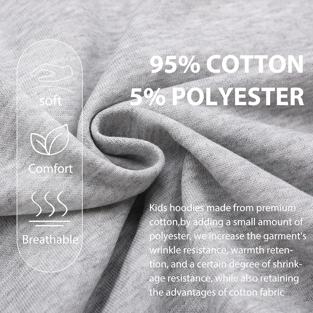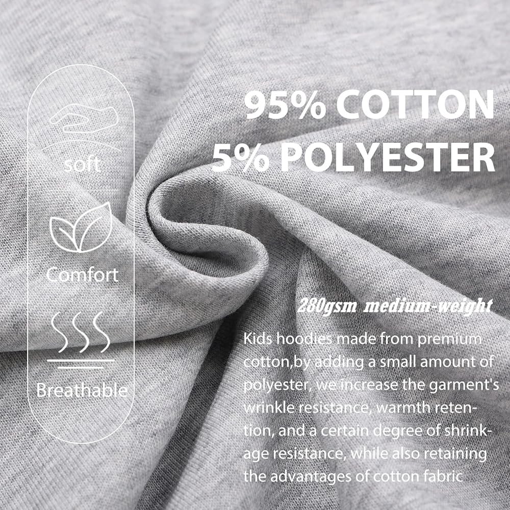 Kids hoodie is made of 95% cotton and 5% polyester. By adding a small amount of polyester, we increase the garment's wrinkle resistance, warmth retention, and a certain degree of shrinkage resistance, while also retaining the advantages of cotton fabric