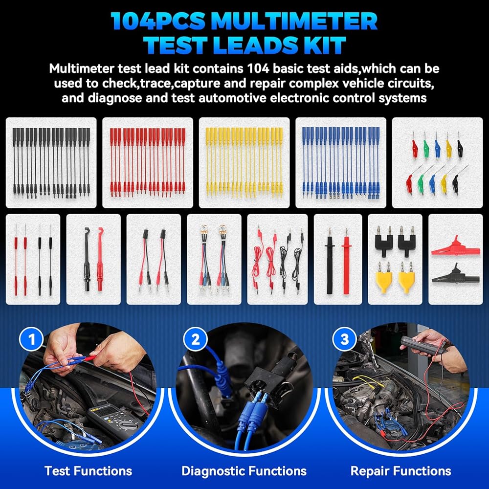 【104PCS Multimeter Test Leads Kit】The test lead kit can be used quickly for adjustment and helps the technician accurately check car problems.Not only for automotive diagnostics, testing and repair, but also in physics labs, workshops, schools, homes and industries. It is an important tool for mechanics to troubleshoot the increasing number of sensors, actuators, electronic circuits and automotive electrical appliances on vehicles.