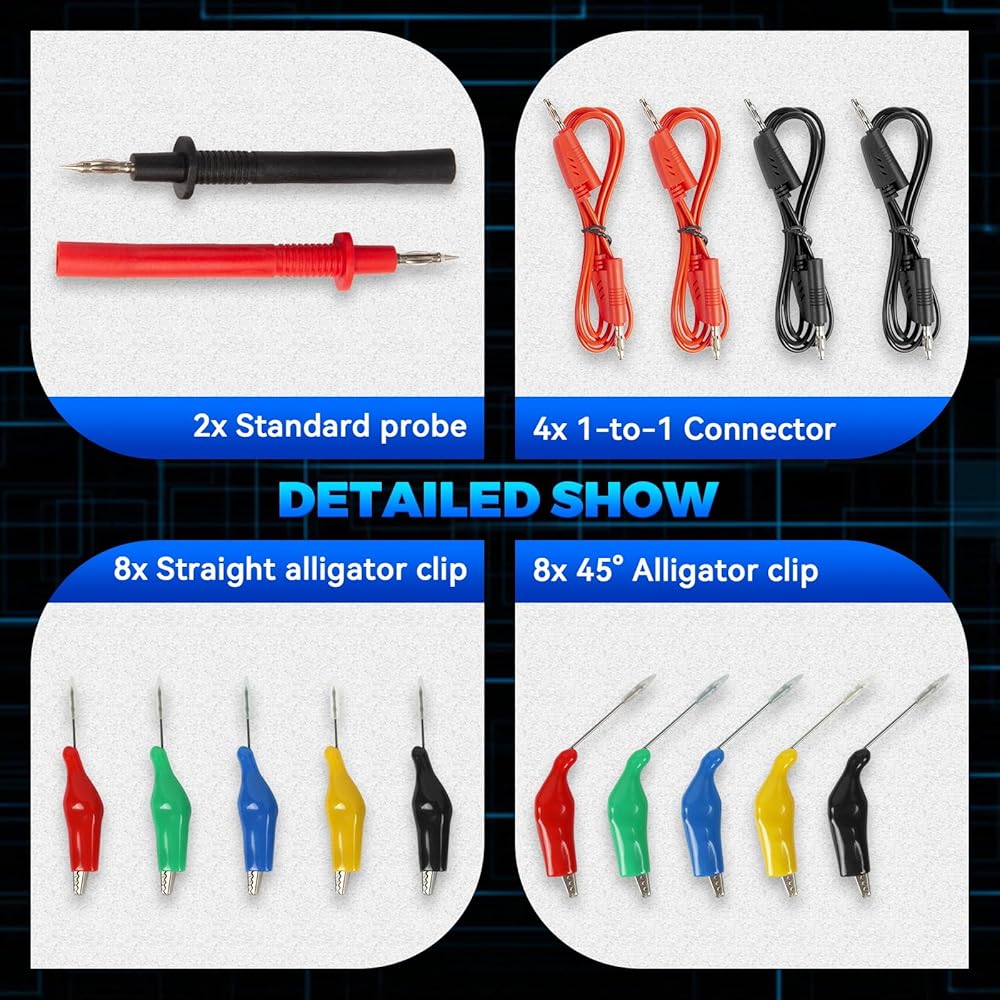 【What You Can Get】Terminals x72 (48 flat terminals and 24 round terminals);SRS Connector x2;1-to-2 Connector x2;Alligator Clip x2;LED Stroboscope x2;Standard Probe x2;Acicular Probe x4;Potentiometer (5KOhm) x2;1-to-1 Connector x4; Piercing Probe x2; Straight Back Probe x5 ; 45° Back Probe x5; Black carrying case.