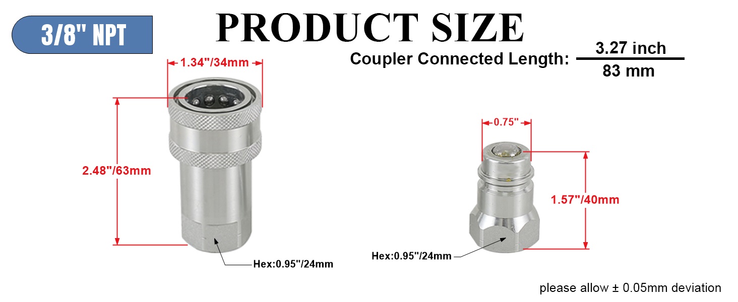 Package Includes: 1/2″ NPT 2 Sets hydraulic quick connect couplers. Coupler ISO (ISO 5675),equipped with poppet valves that automatically open when coupled,preventing any leakage within the rated working pressure.