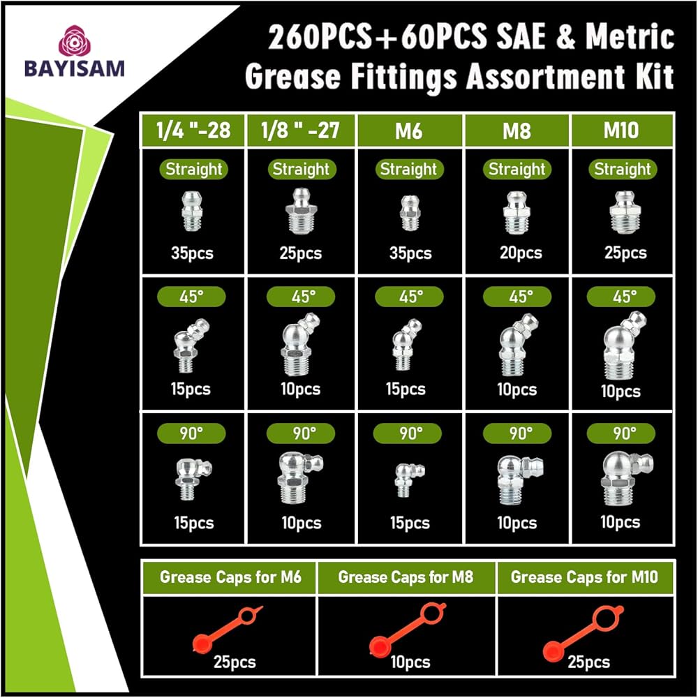 UNIVERSAL SIZES,MULTIPLE KITS: Our Zerk grease fitting kits include the most commonly used SAE and Metric grease fittings in various combinations to meet different application needs, along with three sizes of grease fitting caps compatible with different grease fittings.
