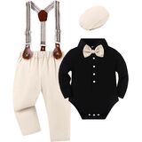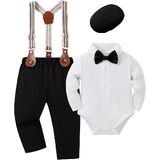 Comfortable fabric: Baby boy suit made of high-quality fabrics, ensuring a soft, comfortable, and breathable experience for your boy. Better protection to baby's skin. Package: 1 * dress top +1 * pant + 1 * bowtie + 1 * suspender + 1* beret Hat.