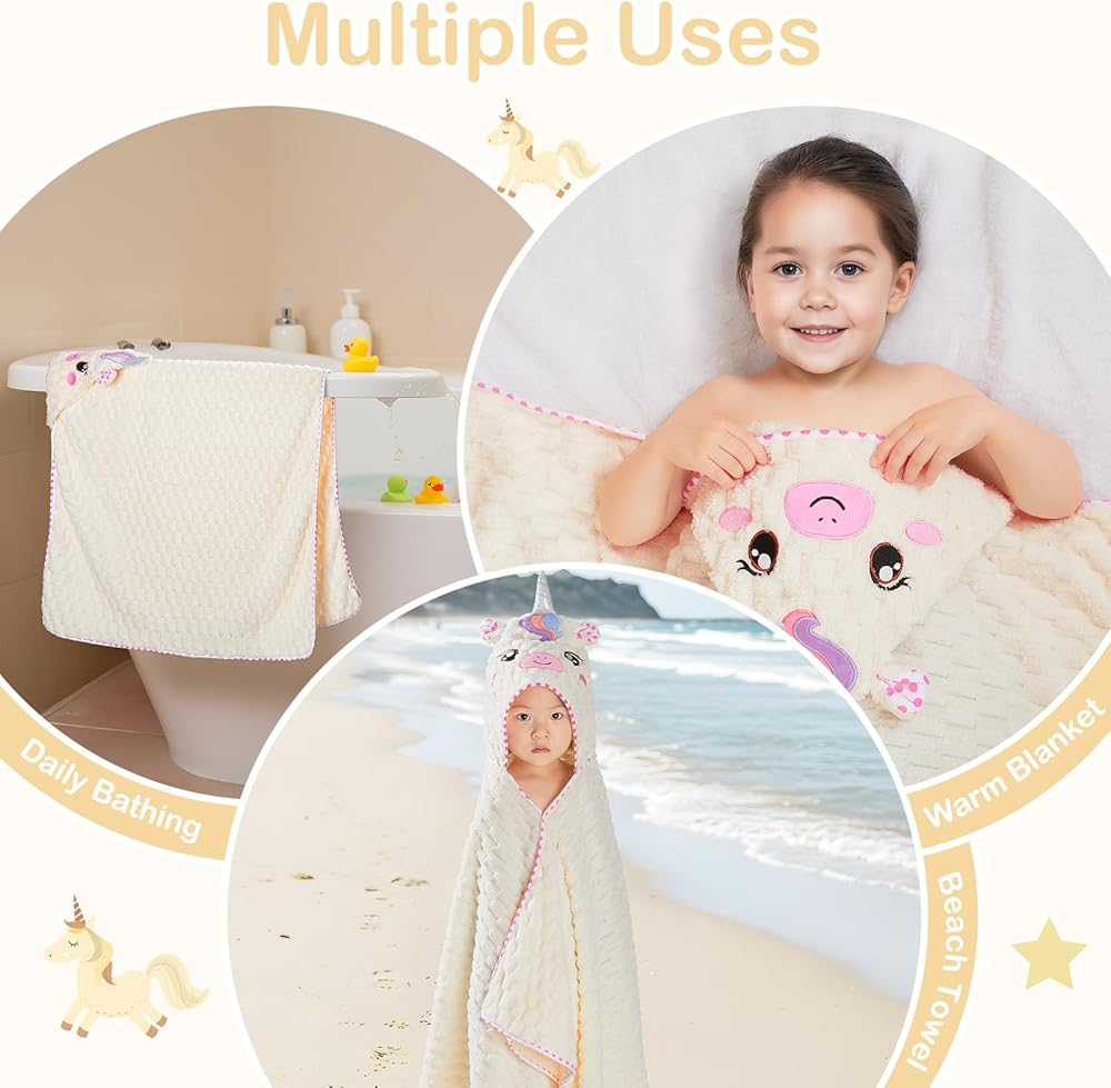 Super Absorbent: Baby bath towels are made from ultra-soft fleece and offering excellent water absorption to keep your little one dry after bath time, swimming, or beach play; The towel also provides warmth, windproof, and sun protection for a care experience