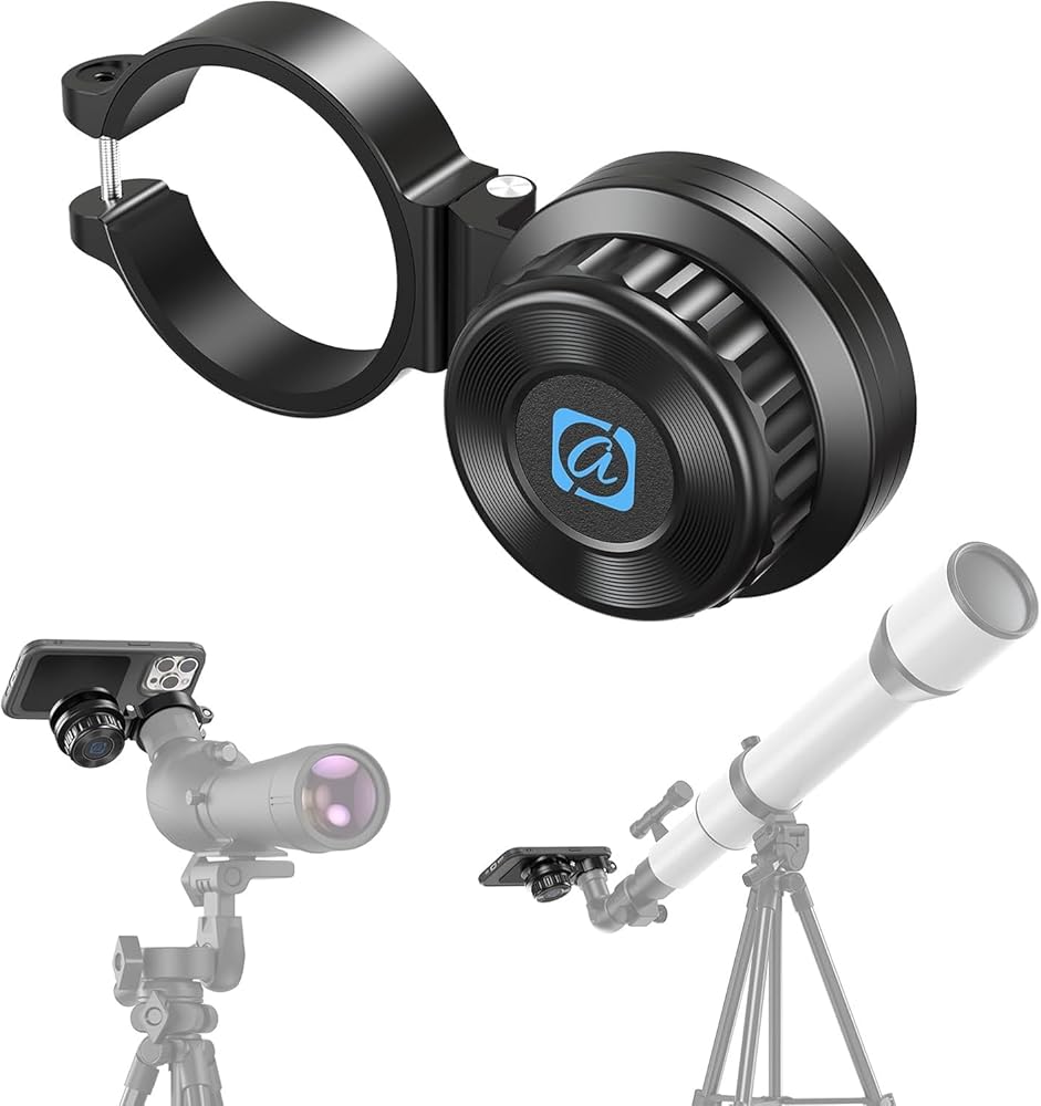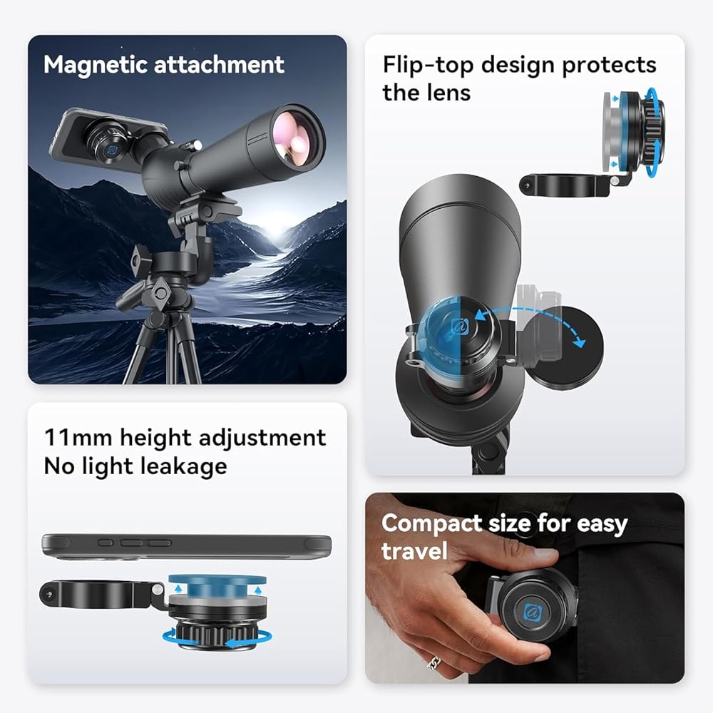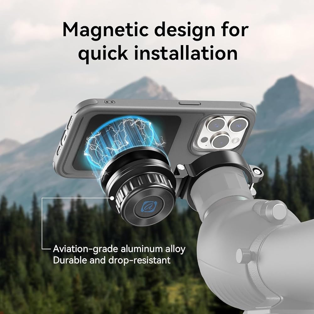 【Magnetic Mount, Simple & Secure】This telescope phone adapter features an innovative magnetic design with built-in N52 rare-earth magnets. Strong and reliable, it eliminates the need for complicated installation steps and prevents scratches on your equipment. Quick attach & detach makes it ideal for outdoor use.