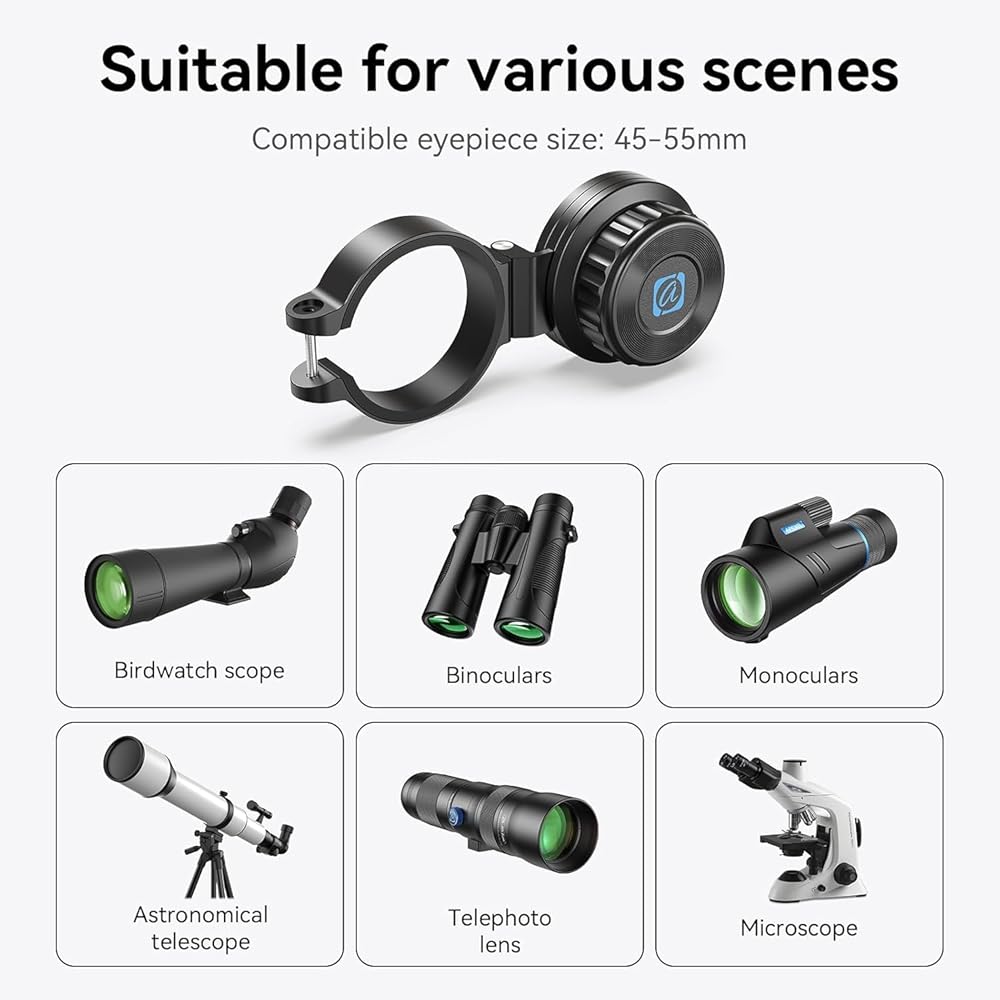 【Wide Compatibility】Our magnetic phone adapter works with 99% of popular smartphones. Since the Phones' built-in magnetic coils vary in position across different models, we recommend using the included magnetic sticker on the back of your phone or phone case for best results. The adapter fits eyepieces with a diameter of 45–55mm.