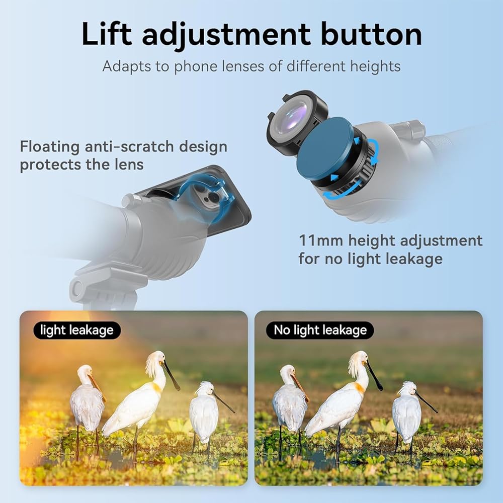 【Adjustable Eye Relief】Our magnetic phone adapter features a built-in adjustment knob that allows up to 0–11mm of eye relief. This ensures perfect alignment with a wide range of devices, including spotting scopes, binoculars, telescopes, rifle scopes, and microscopes. The knob has a textured, anti-slip design, making it easy to use even while wearing gloves.