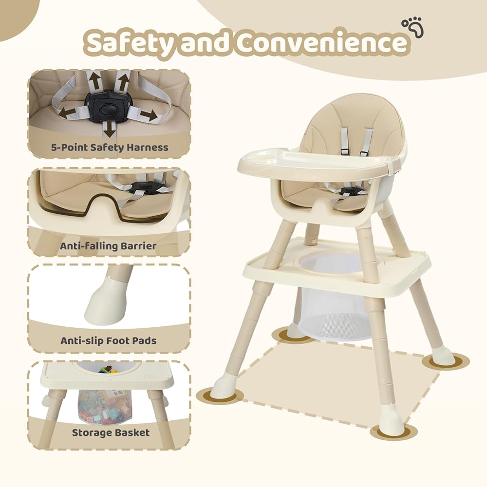 Safe Option: Five-point safety harness; Meet or exceed all ASTM and applicable CPSC standards; Anti-slip rubber feet reduces unwanted sliding; Fixed safety baffle to prevent falls; Meal tray made of non-toxic and food-grade PP