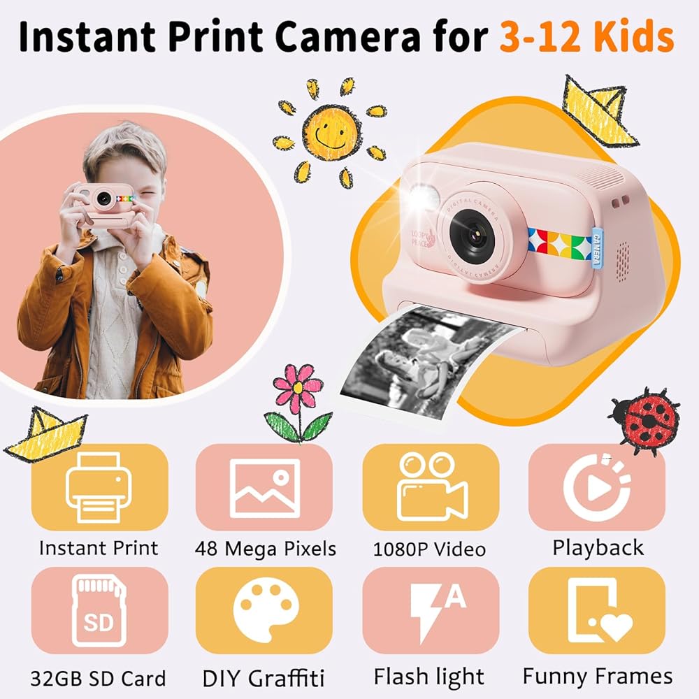 Spark a love for photography with this all-in-one instant camera for kids! It's packed with features for endless fun: Instant 5-Color Prints(Orange, Green, Rose, Blue, and Black & White) with 6 included print paper rolls; With 48MP Photos & Video Recording saved to a 32GB card; and Creative Play with 21 cute frames, 2 filters, self-timer, burst mode & manga printing. The perfect gift to inspire any young creator!