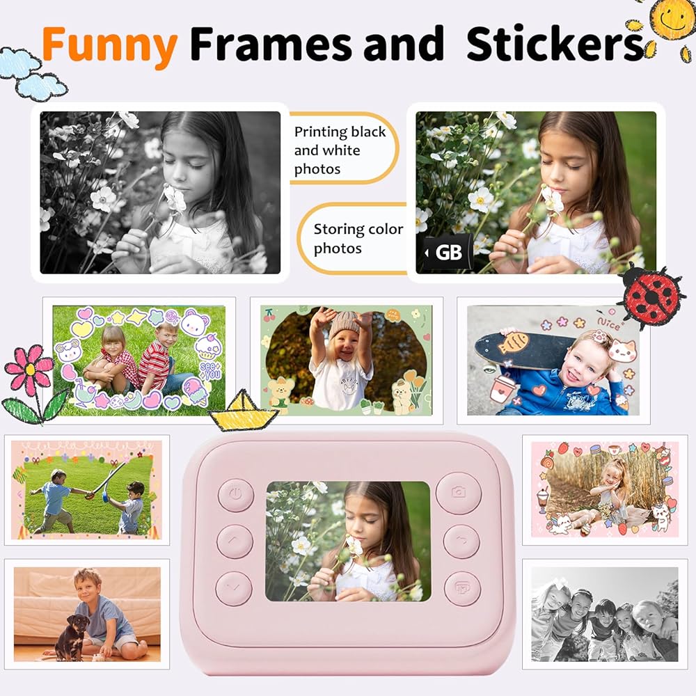 Take Fun Photos and 1080P Videos: Equipped with an HD lens, this kids instant print camera takes vivid color photos and supports 1080P video recording. It also features time-lapse and continuous shooting modes with 21 cute frame options to record more fun and memorable moments