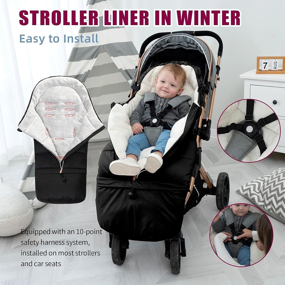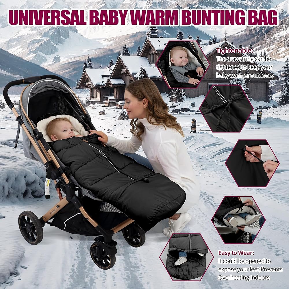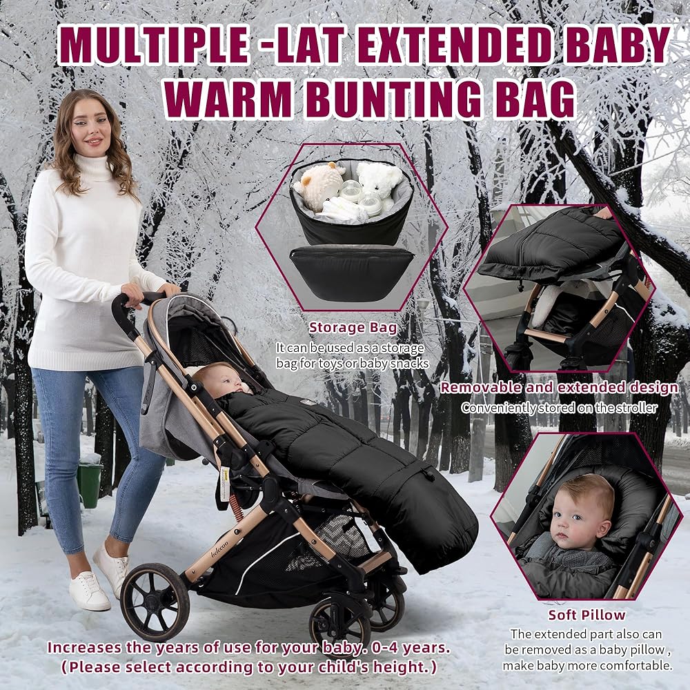 【RELIABLE SAFETY DESIGN】The tail of theBunting Bagsis detachable.Also the detached part can also be used as a stroller storage bag.Equipped with 5 Harness Slots.Fitting most 3 or 5-point belts Stroller keep babies extremely safe.Equipped with Drawstring Hood, keep your baby's face warm.