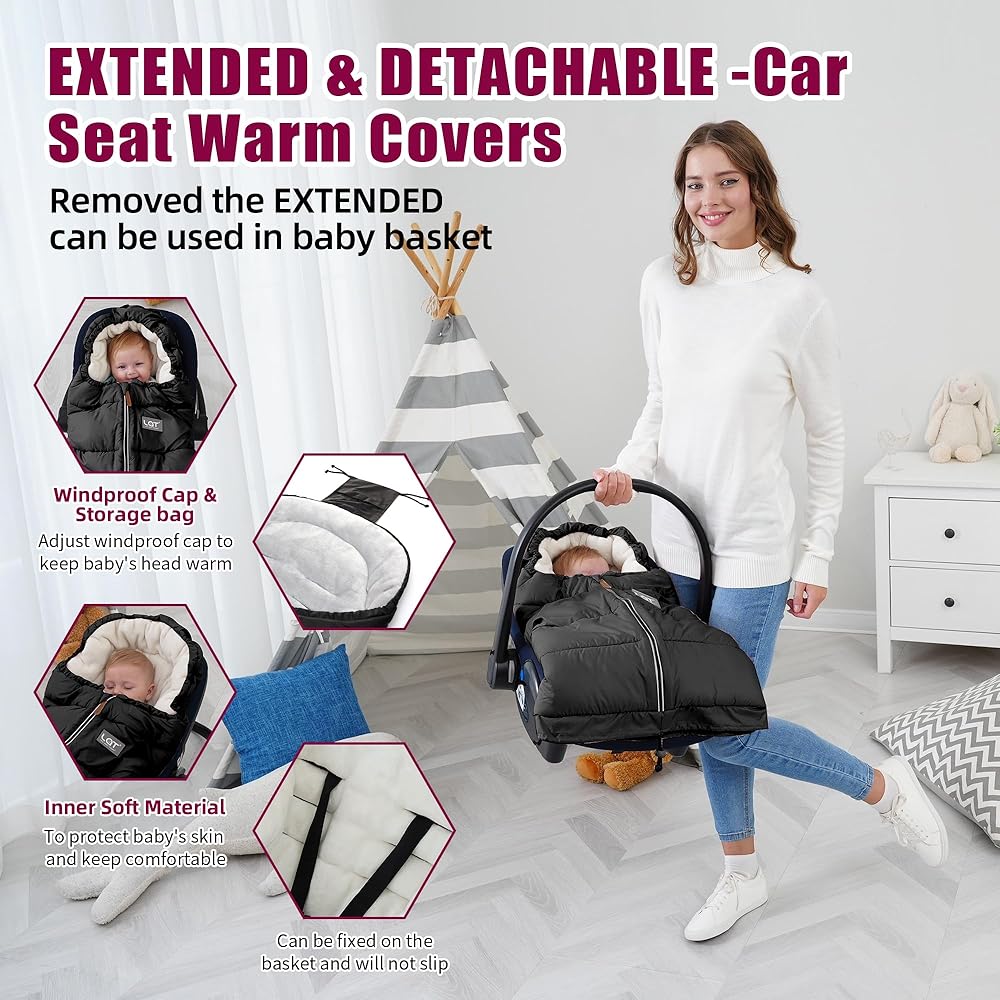 [ZIPPER PULL DESIGN]: All zippers are fully, easy for baby in and out. It can be unzipped from top to bottom for quick diaper changes and easy dressing.Unzip footmuff bottom for temperature control.It can be removed via a detachable front zipper and easily convert to a cozy seat cover.