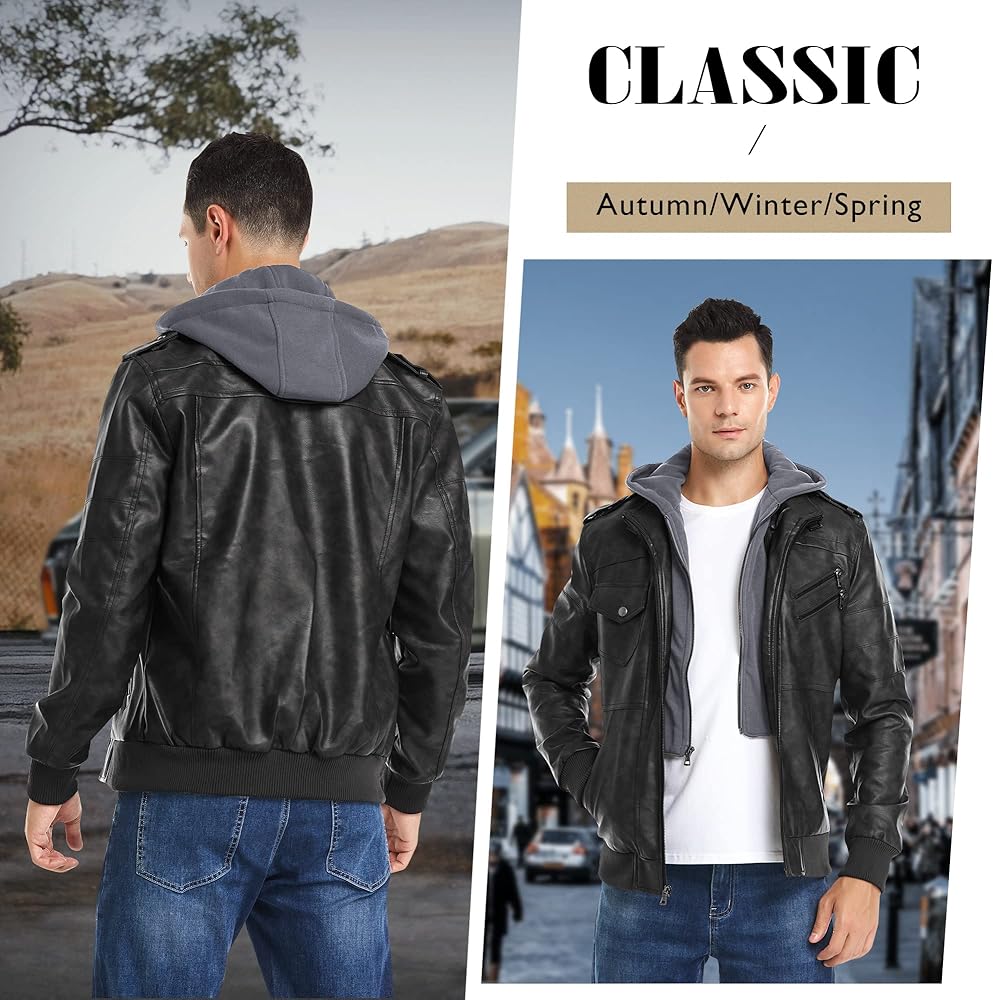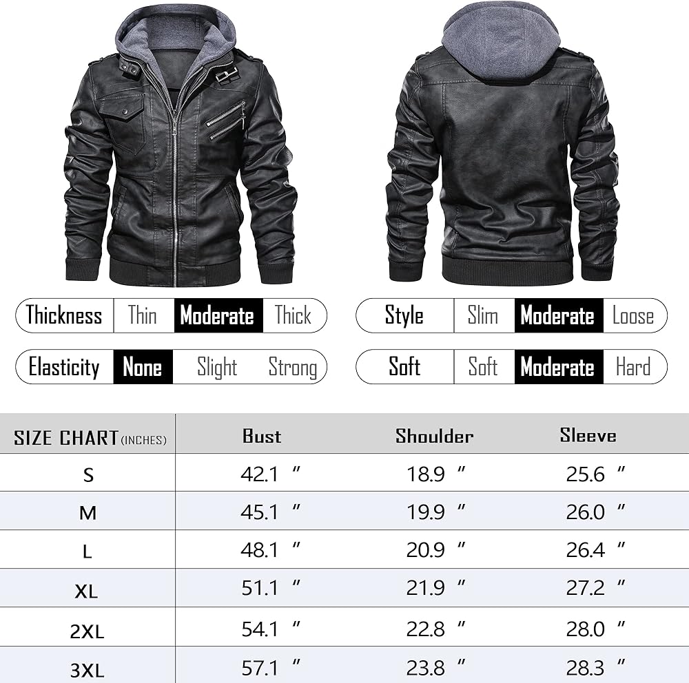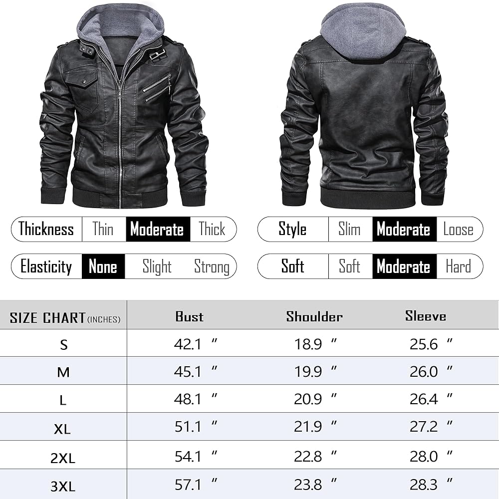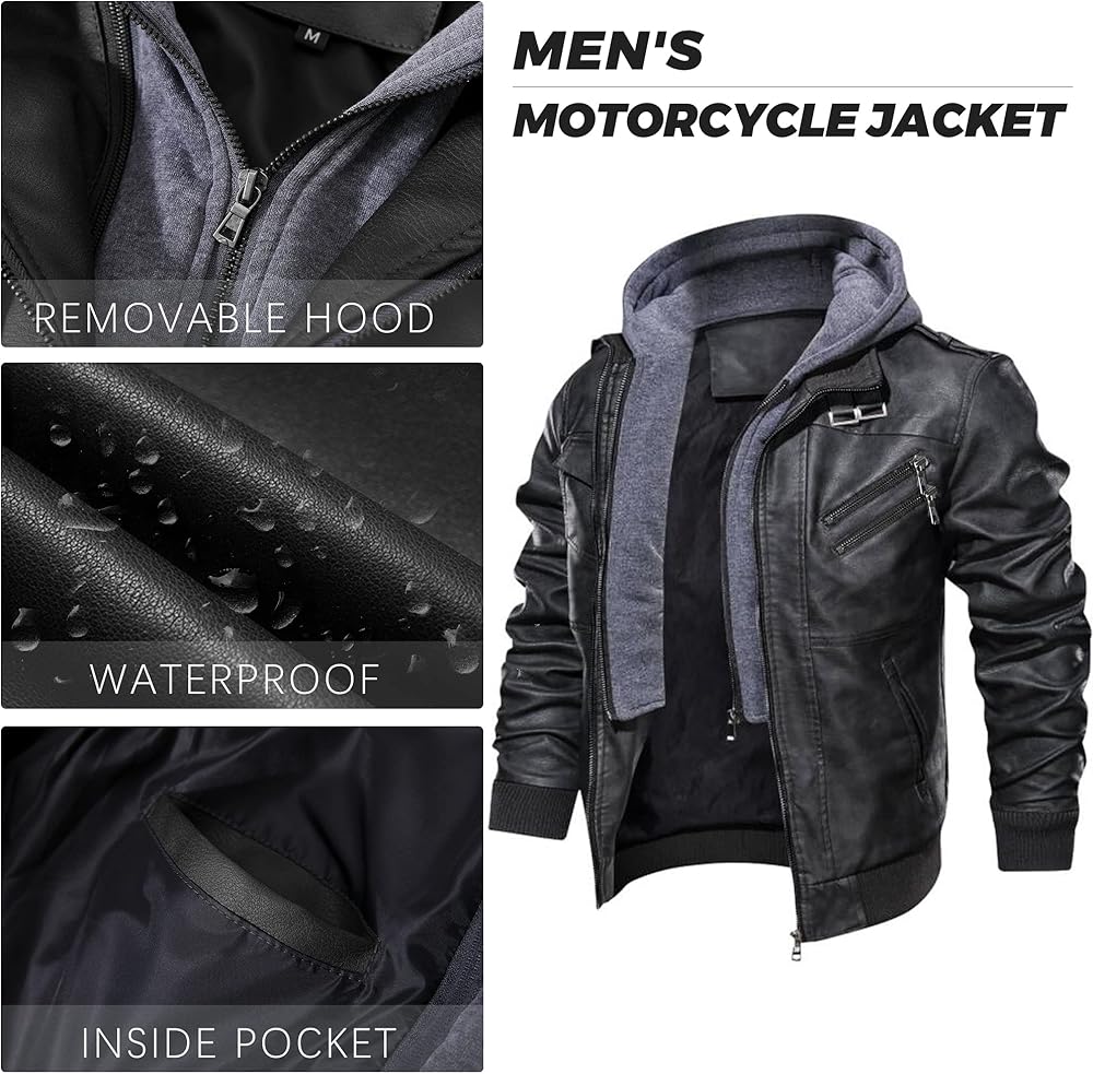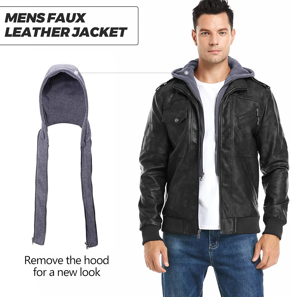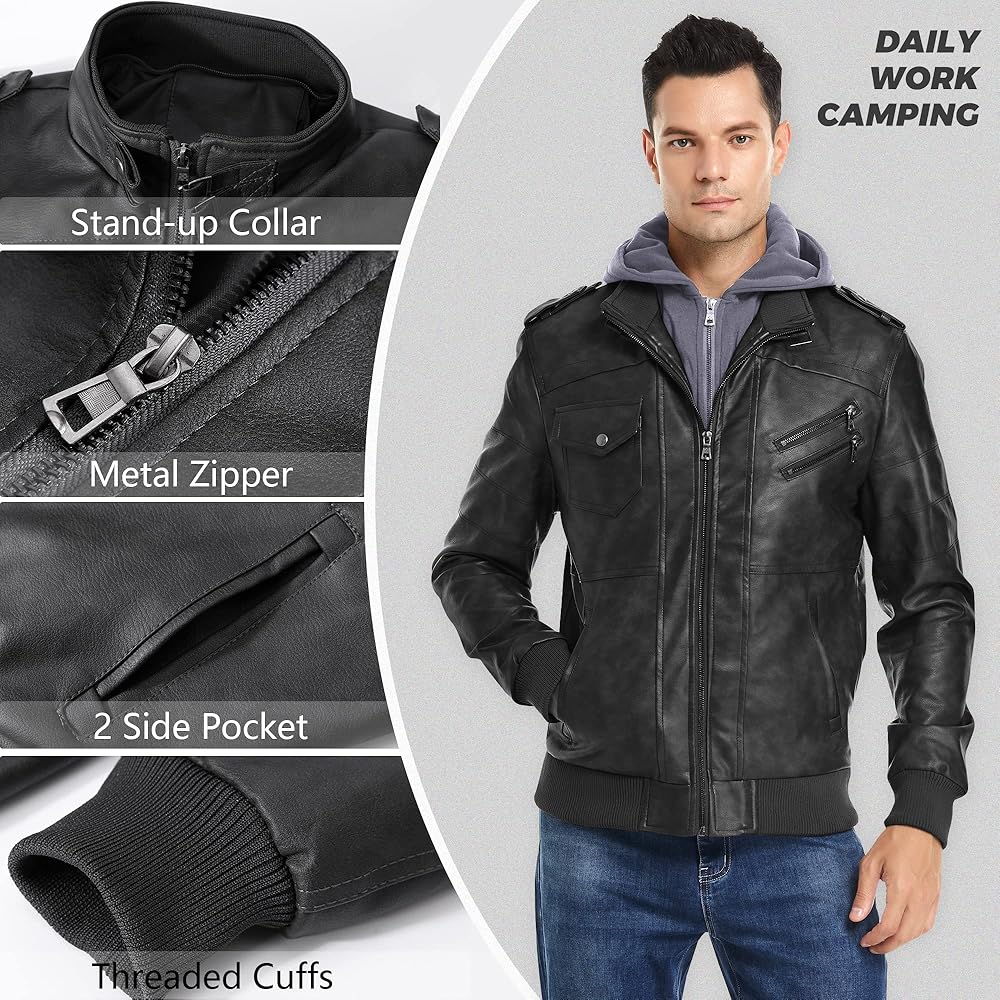 Design:This jacket with removable hood give you two different styles,fashionable hooded jacket and vintage stand collar leather jacket.Zipper closure,elastic cuffs and removable hooded reinforce the wind protection in cold weather.
