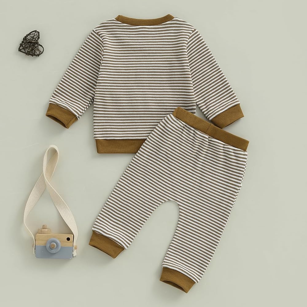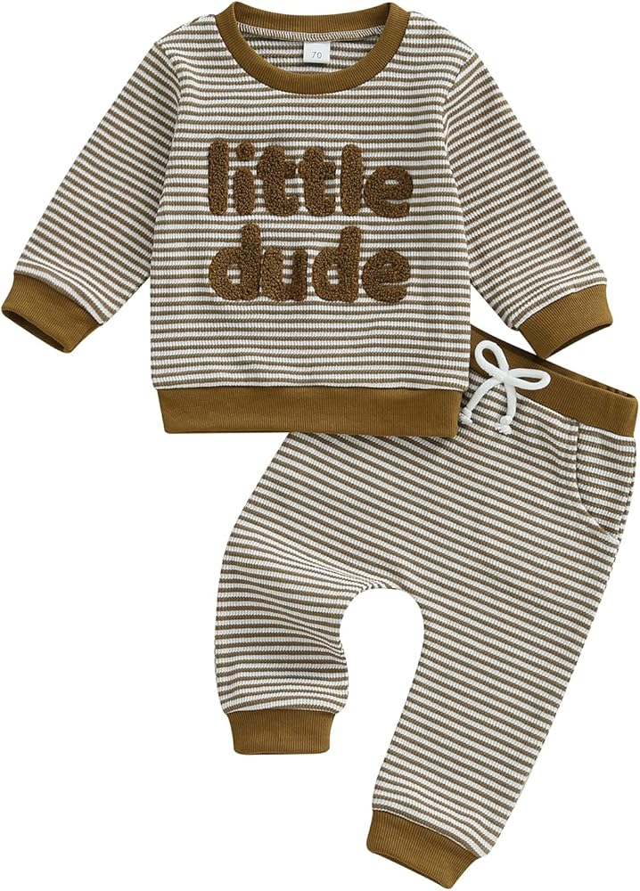 Design: Toddler boy fall outfits, infant boy fall winter outfit, baby boy striped outfits, long sleeve round neck letter embroidery pullover tops, paired with elastic waist casual pants, infant boys sweatsuit, baby boy 2 piece outfits, very cute