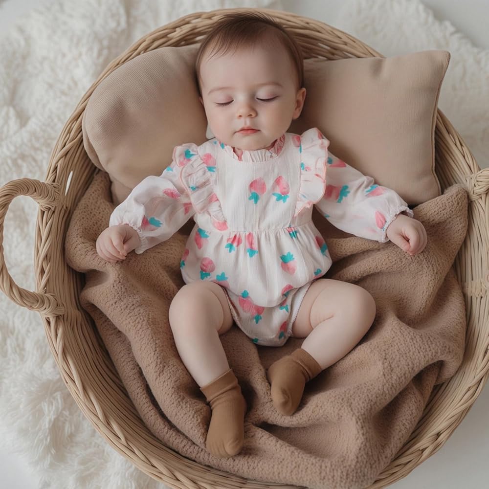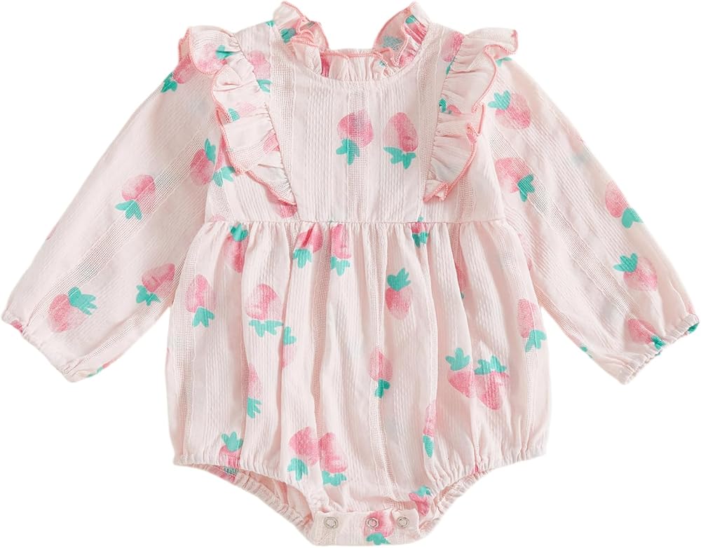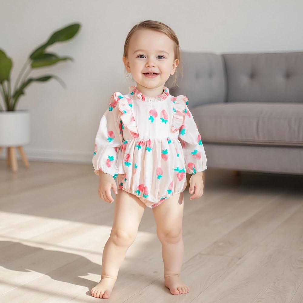 - Details: baby girls long sleeve romper, baby girls fall romper, baby girl fall jumpsuit, baby girls cotton linen romper, floral print, ruffles, round neck, long sleeves, crotch buttons