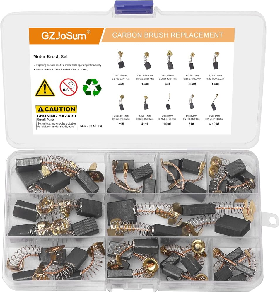 Package Included: 60Pcs carbon brushes 10 sizes, each size 6Pcs(7x17x19mm, 5x11x18mm, 6.5x7.5x13mm, 6.5x13.5x18mm, 6x10x17mm, 6x9x14mm, 7x11x18mm, 6x8x14mm, 5x8x13mm 5x8x15mm), which can meet most needs. Please select the corresponding size based on your needs, come with a plastic box for easy storage and carrying
