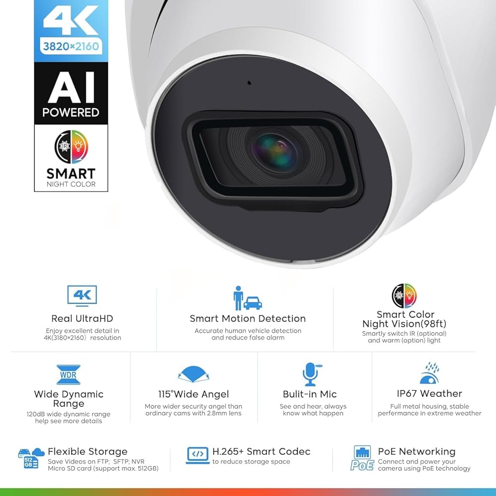 【Powered Smart Detection】8MP PoE Dome Camera with advanced AI algorithms enable 99.7% accurate human/vehicle detection with IVS (Intrusion/Vehicle Tracking System). Get real-time alerts when someone crosses your predefined zones while minimizing false positives. Built to withstand extreme conditions with 98ft infrared night vision (even in complete darkness).