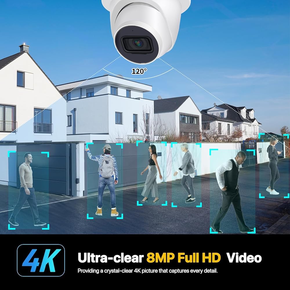 【4K Ultra HD Clarity】Equipped with a 1/2.8” CMOS sensor and a 2.8mm ultra - wide - angle lens, this 8MP dome camera delivers 3840×2160@20fps crystal - clear video with a 112° wide field of view. It captures every detail in stunning high definition, making it perfect for home security, business surveillance, or outdoor use.