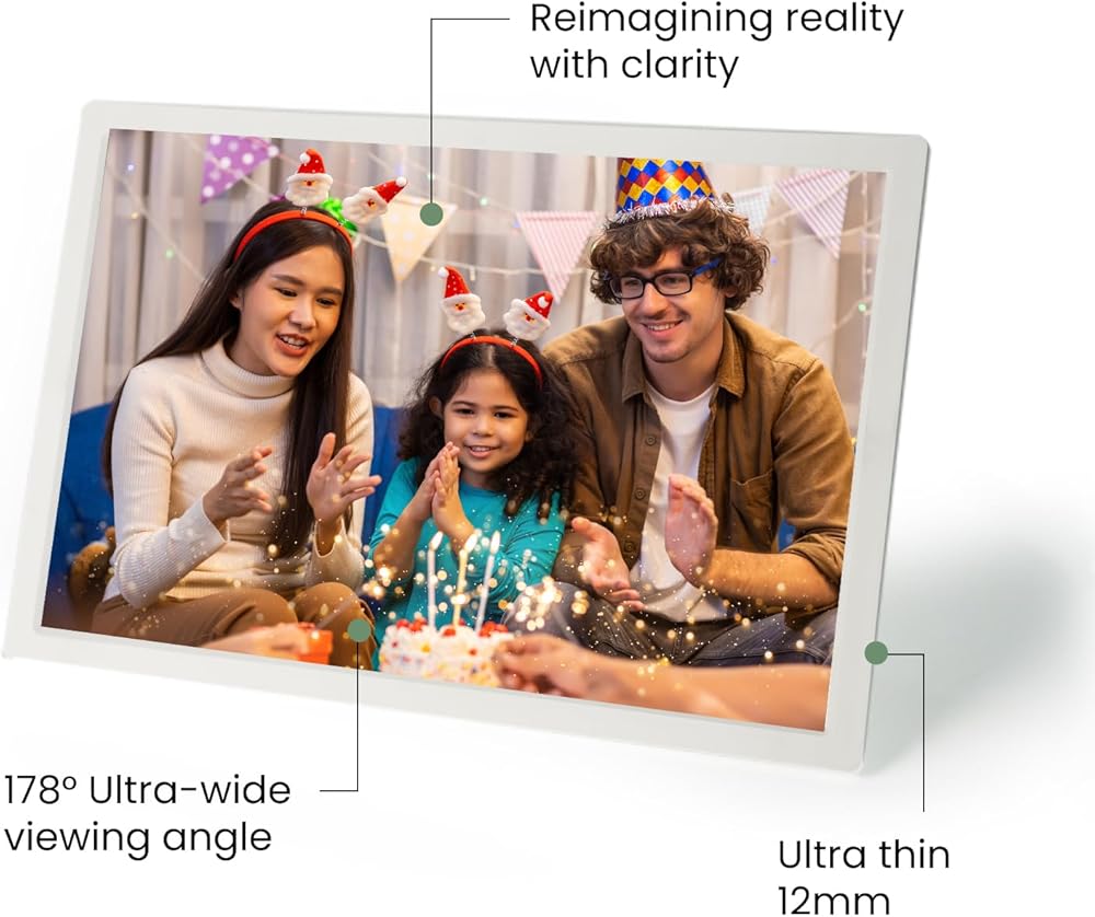 PINTURA 16" WiFi Digital Picture Frame – 1080p FHD, Magnetic Wall Mount, 64GB+8GB Cloud Storage – Perfect Holiday Gift Transform your memories into a vibrant gallery with the 16" PINTURA Digital Frame. 1080p Full HD IPS Screen: 1920x1080 resolution & 178° ultra-wide viewing angle bring photos/videos (15-sec clips) to life, perfect for holiday reunions or anniversary collages. Effortless Magnetic Mount: Rotate 360° horizontally/vertically with no nails or tools—ideal for kitchens, bedrooms, or Christmas tree displays. Instant Sharing & Secure Storage: Send memories via the Pintura App to family worldwide. 64GB internal + 8GB free cloud holds 60,000+ photos. Invite-only access protects wedding albums or kids' milestones. Smart Features: Auto-rotate photos, schedule brightness for festive dinners, and control multiple frames remotely. Dual-band Wi-Fi (2.4G/5G) connects in seconds. Gift-Ready Luxury: Pre-load “2023 Family Moments” or a surprise proposal video. Sleek black frame with wall/desk mounts—no subscriptions, just lifelong memories in 1 click.