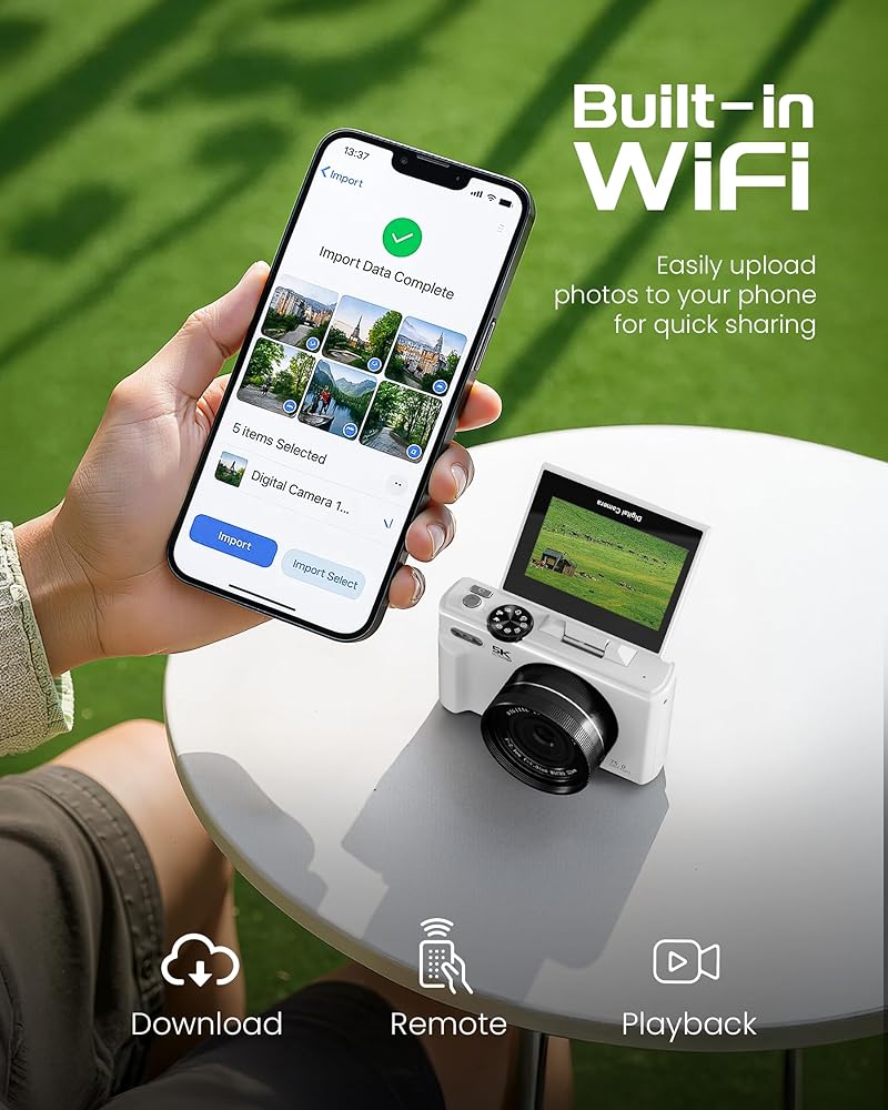 【Wireless WIFI & Webcam】This video camera comes with powerful WIFI connectivity, allowing you to instantly transfer photos and videos to your smartphone or tablet via a dedicated app. You can also connect the camera to your PC using a USB cable for quick file transfer. Additionally, digital cameras can function as a webcam, perfect for live streaming, video calls, and blogging. Whether you're live streaming on YouTube or making high-quality video calls, it's all possible with ease.