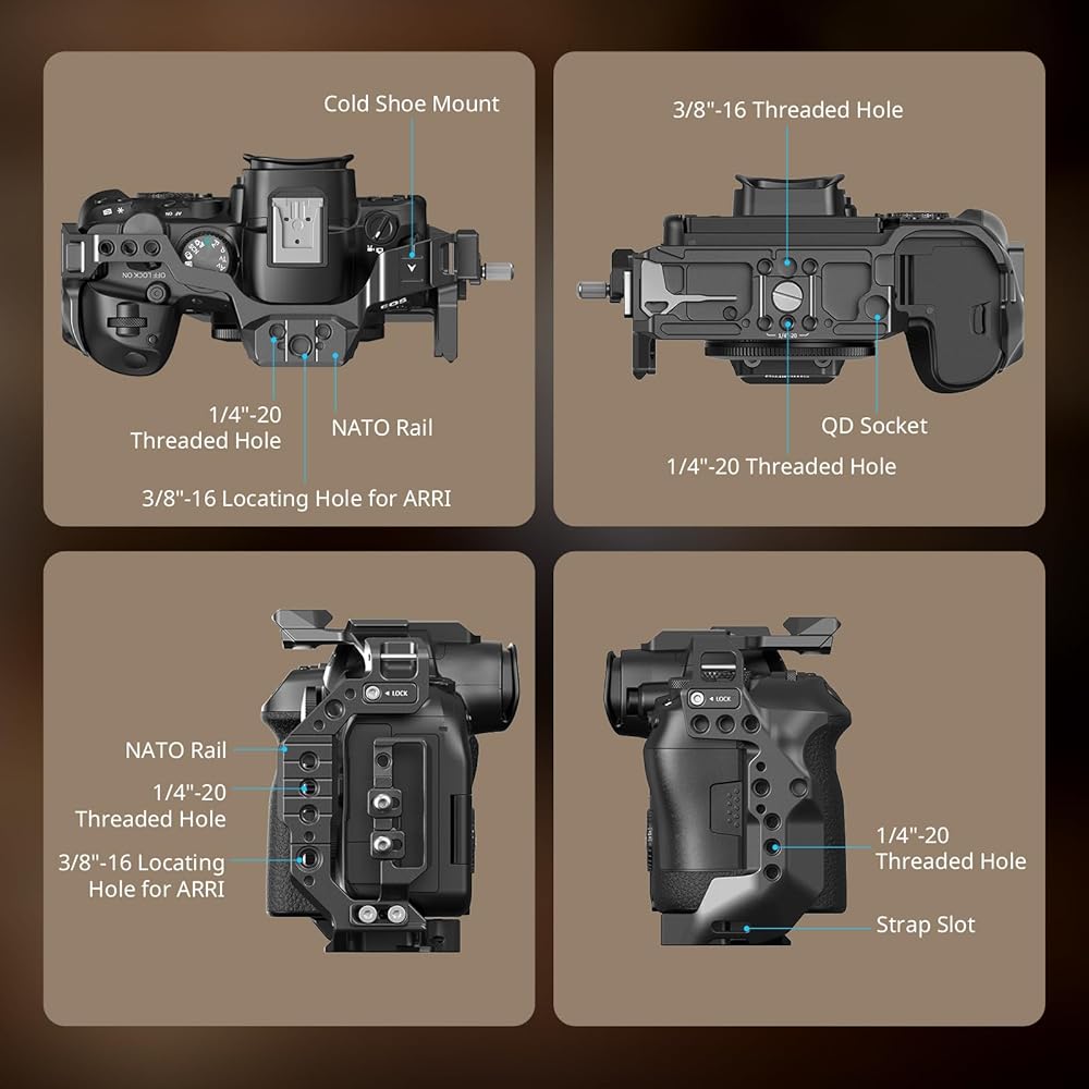 For Canon R6 Mark II: This cage kit is customized for Canon R6 Mark II, locking the camera via one 1/4"-20 screw at the bottom and one side lock adapter on both sides. It also maintains full access to the button, card slot, screen, and battery door.