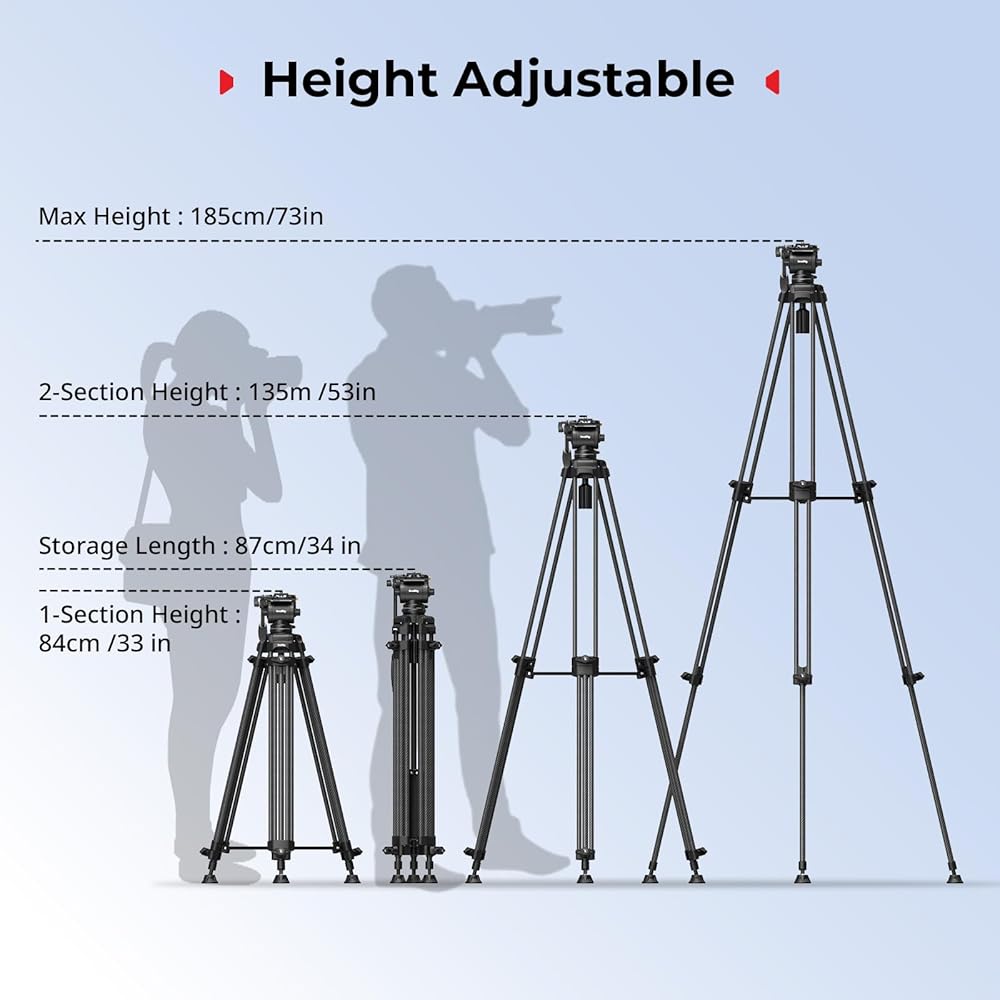 73" / 186cm Tall Video Tripod: The video tripod has a height adjustment range from 34"-73" (85cm –186cm ) which can meet most shooting, The tripod can be folded to be 35" (88 cm) with a customized carrying bag for better storage, protection, and carrying around.