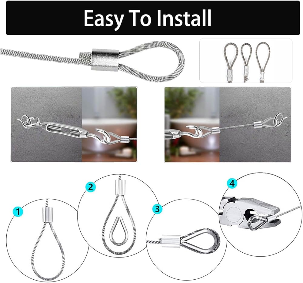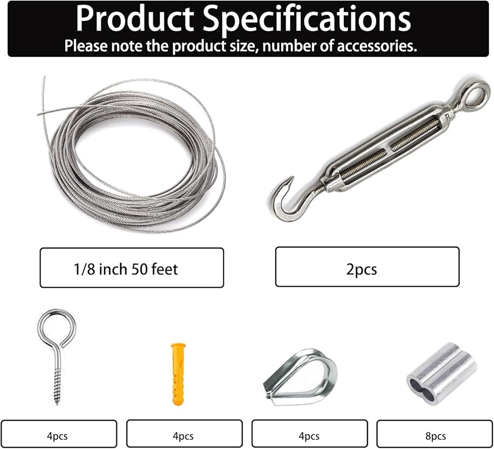 【Wire Rope Kit】1/8" 50ft Wire Rope; 8 x Aluminum Crimping Loop Sleeve; 4 × Wire Rope Thimble; 4 x Eye Screw; 4 x Plastic Anchors; 2 x Turnbuckle.