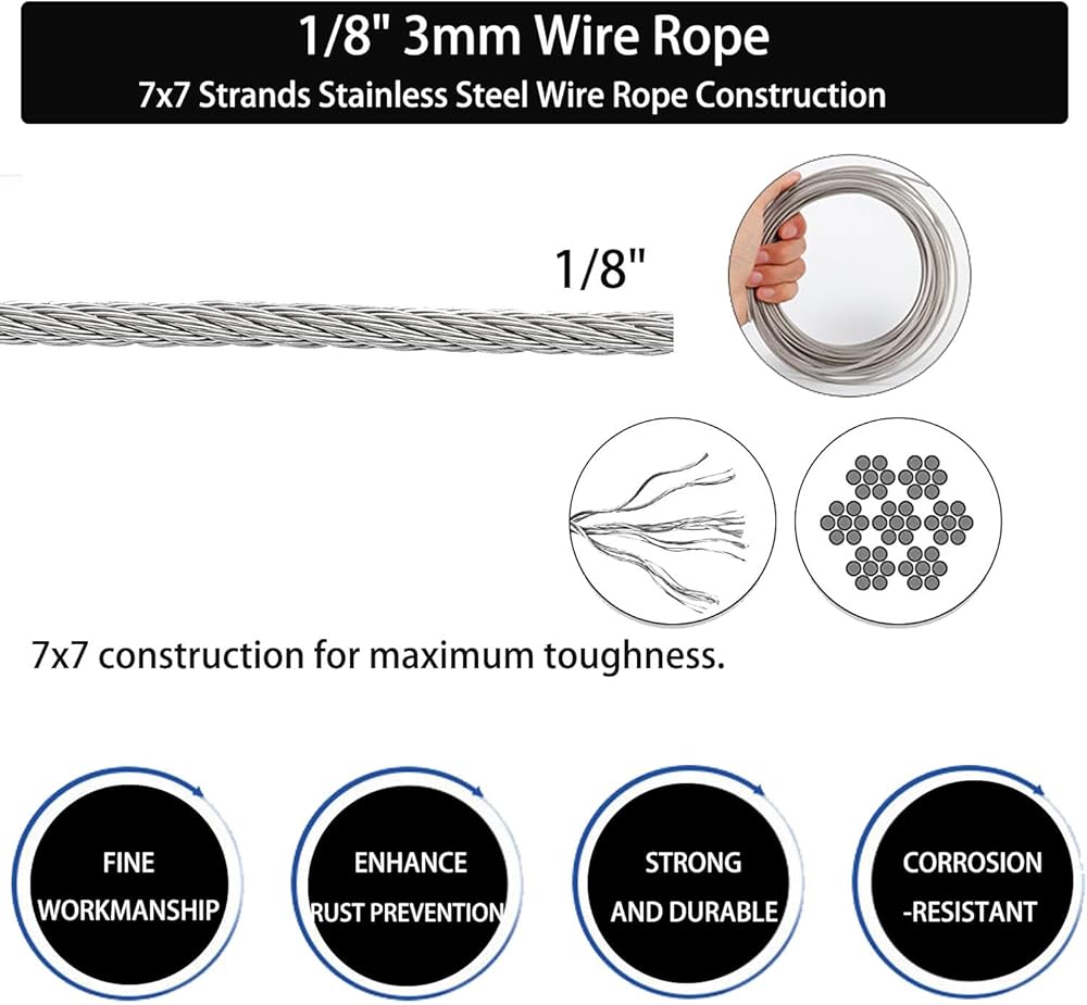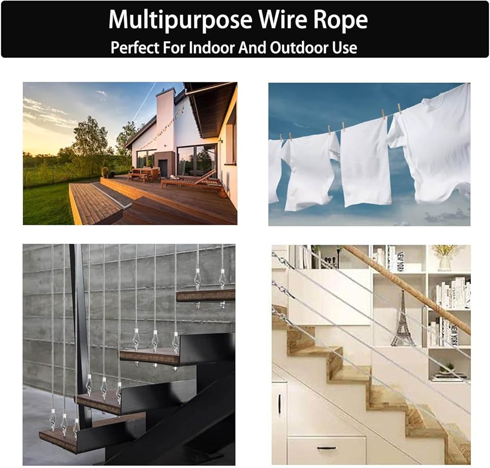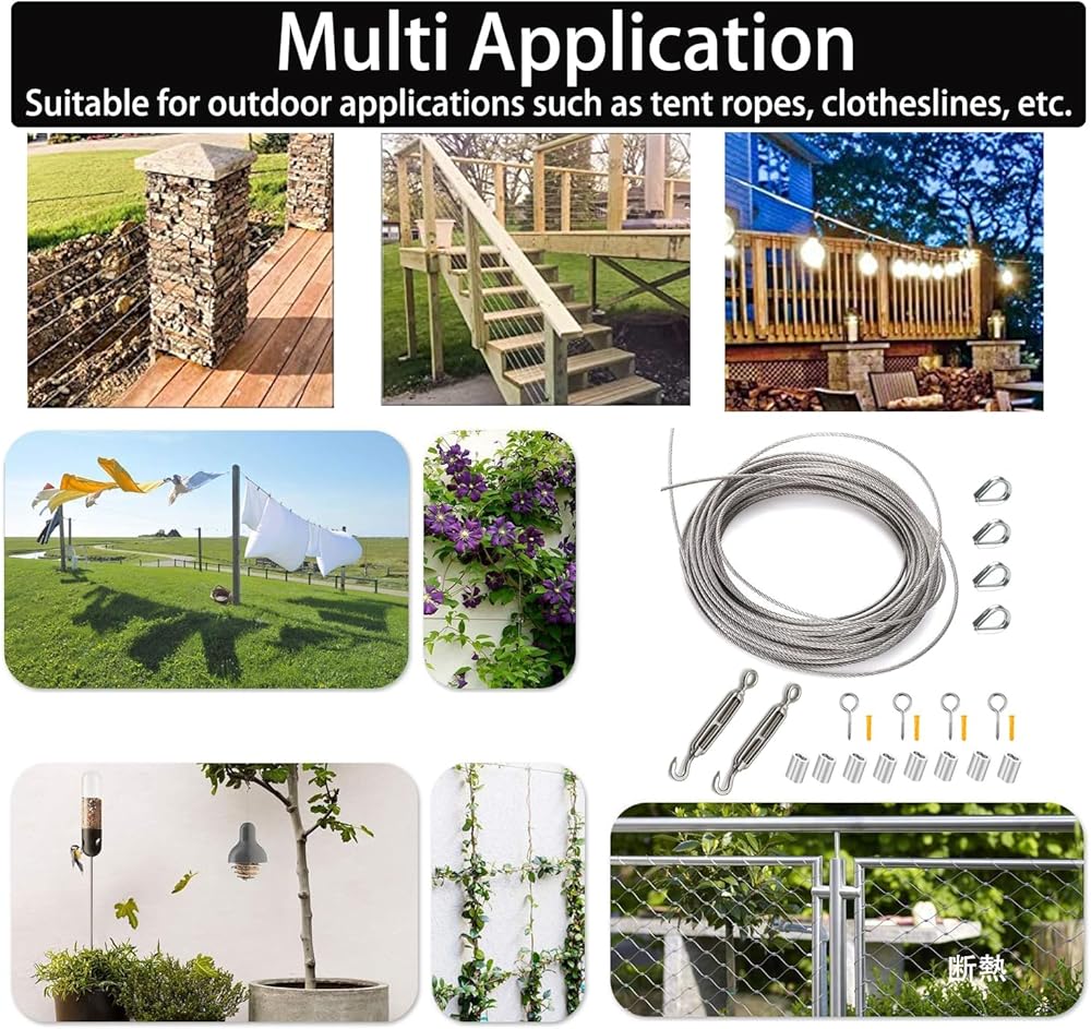 【Wire Rope Kit Multi-purpose】Length can be cut as needed, it is perfect for indoor and outdoor use. Our multifunctional wire rope can meet your daily needs, like loads hanging, DIY garden fencing, supporting your plants, stair handrails, string lights, clothesline, shade sail, get creative and spice up your house decor,etc.
