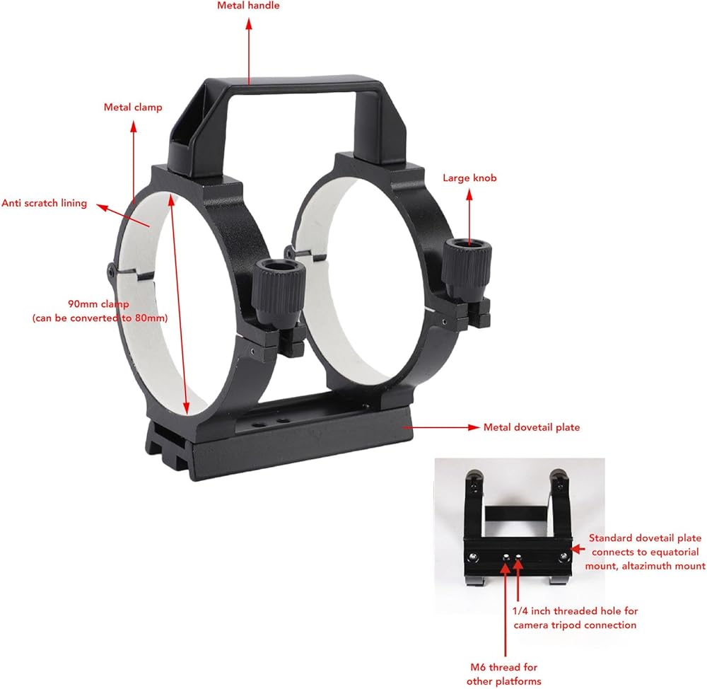 [Versatile and Secure Fit] Adapt to 80-90mm tubes with padding strips for flexible mounting on various telescopes and mounts. equipped with a dovetail plate for easy connection to equatorial systems and altazimuth platforms.
