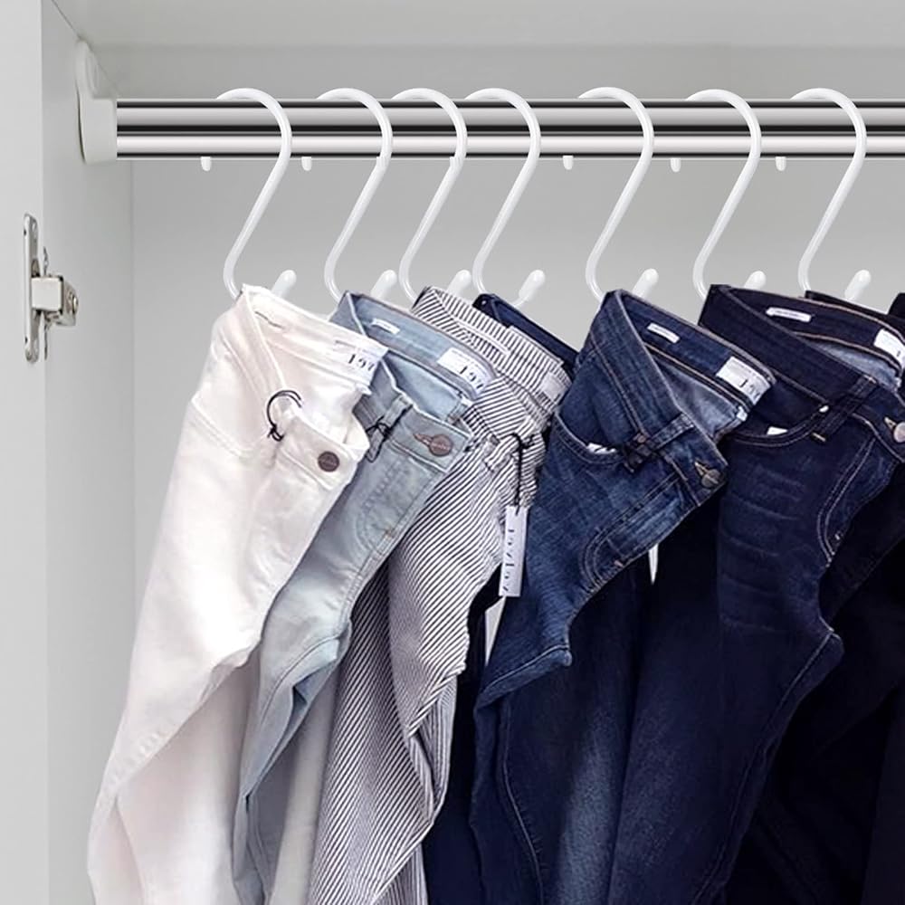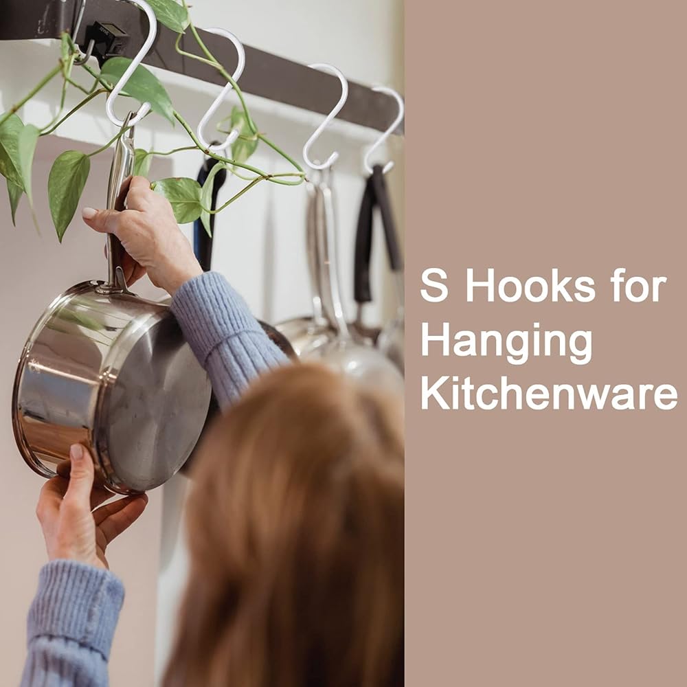 Multi-function S Hook: HiGift vinyl coated s hooks are widely used indoor and outdoor, closet storage, garage, garden, home and kitchen.Hanging purses, handbags, clothes, jeans, scarfs, hats, belts when using over closet rod. Hanging towels and shower loofah in bathroom. Hanging plant pot in living room, garden. Hanging tools in garage.Hanging Heavy Pans and Pots in Kitchen.