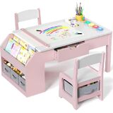 5-IN-1 MULTIFUNCTIONAL DESIGN: This kids table and chairs comes with a hidden lift bar that easily converts the table into an art easel. In easel mode, the under-table storage space instantly transforms into a building block area or craft corner. When closed, it transforms back into the ideal teaching/study toddler desk for kids. With a large 42.9“ L x 22” W tabletop, it provides ample space for parent-child guidance or activities, and is perfect as an art table, game table or dining table.