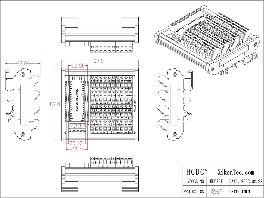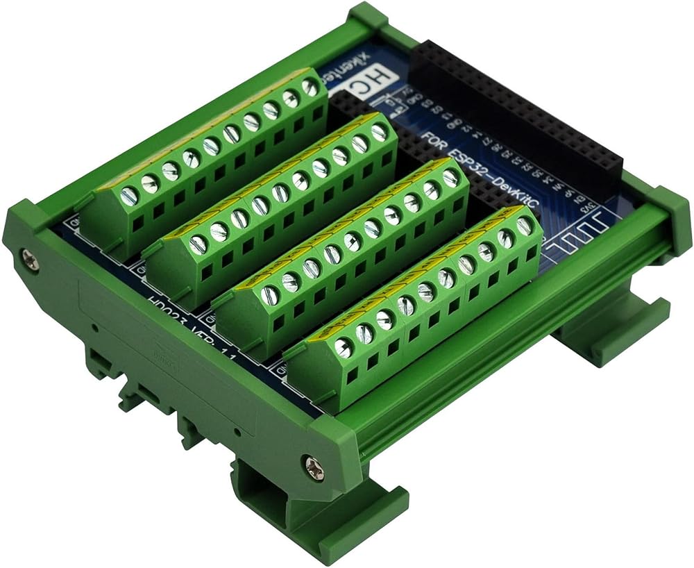 DIN Rail Mount Screw Terminal Block Breakout Board for ESP32-DevKitC. With the breakout board, you can easily extend ESP32-DevKitC projects to industrial control applications.