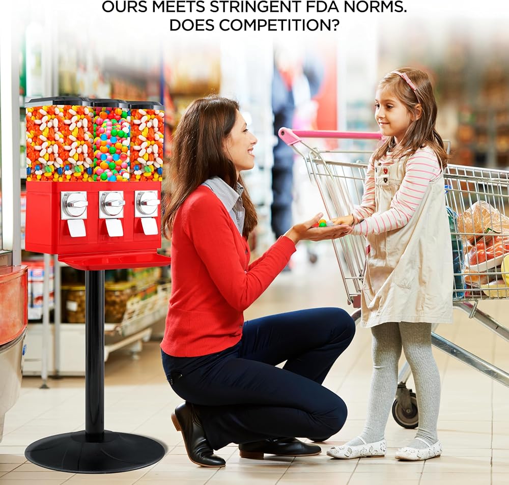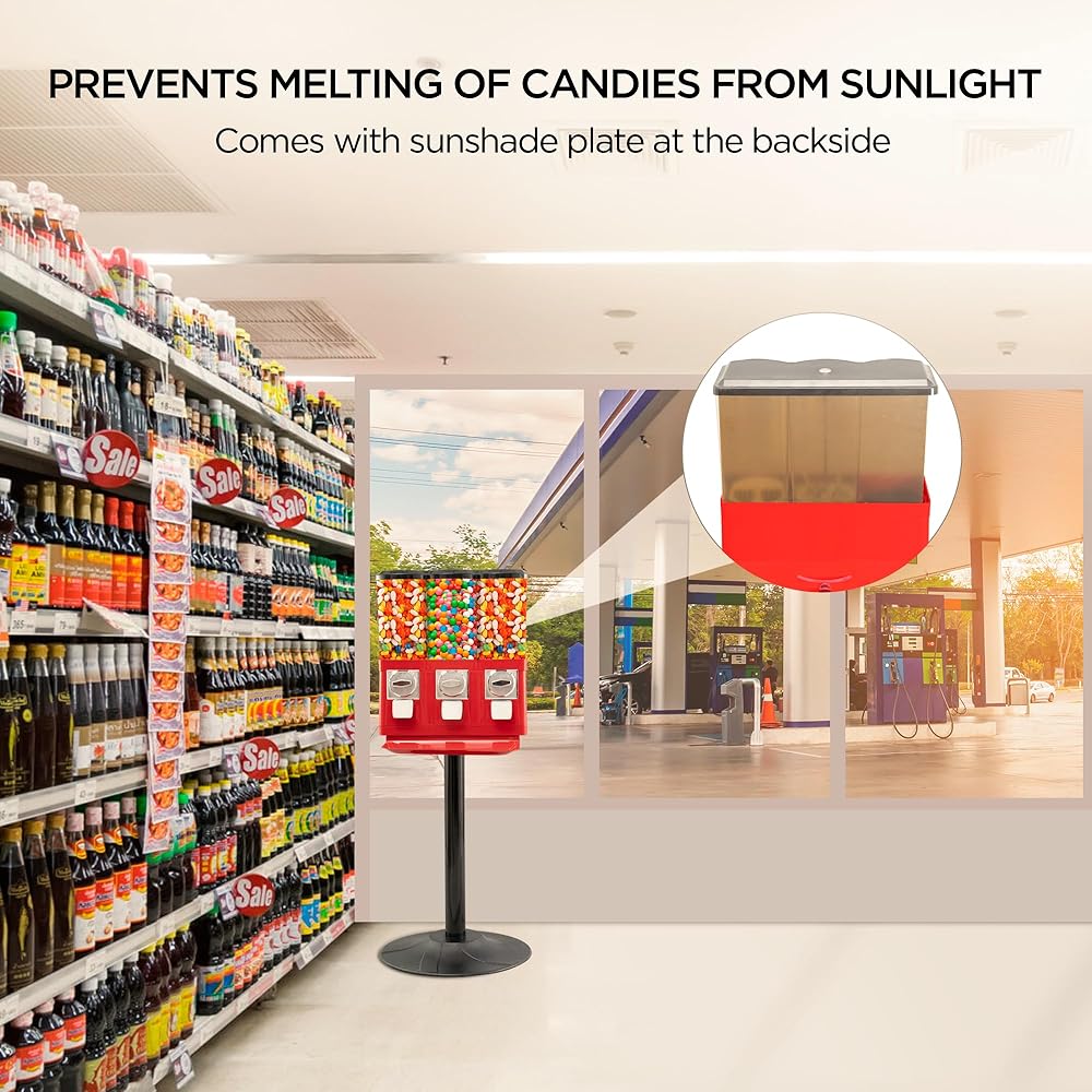 PREVENT GUMBALLS AND CANDIES FROM MELTING Comes with SUNSHADE PLATE that prevents melting of candies and gumballs in outdoor. This candy vending machine is also known as candy dispenser stand, vending machine for business, triple pod candy vending machine, candy quarter machines, vending machine with stand, commercial vending machine, triple candy machine, standing gumball machine, big gumball machine for markets, bulk vending machine, gum machine stand, commercial vending machines for peanut.