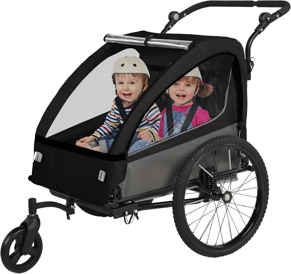 Sepnine 2-in-1 Kids Bike Trailer and Stroller with Suspension – Bike Trailer for 1 to 2 Children, Jogging Function, Foldable, 5-Point Harness, Spacious Storage, with Bug Screen and Weather Shield