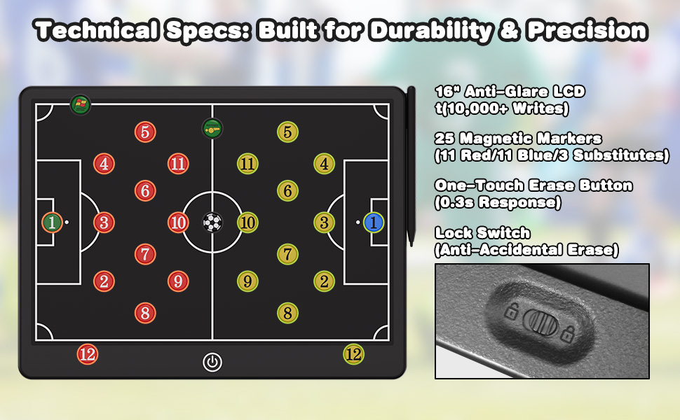 【0.3s One-Click Erase & Lock Screen: Save Time & Avoid Mistakes】 Press the erase button to clear all tactics in 0.3 seconds—10x faster than traditional whiteboards, saving 5+ minutes per training session. The back lock button secures your strategies: tested 20x with 1m drops, your tactics stay intact even during intense game-day adjustments. No more frustrating re-drawing from accidental touches.
