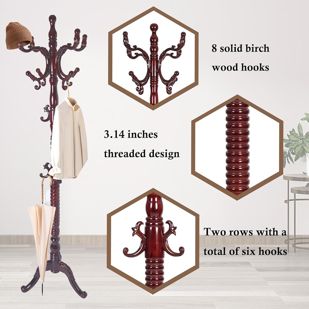 【Wider Application】The wooden coat tree is designed in a vintage style, with a simple structure and comprehensive functions. The coat rack can be placed in the hallway, living room, bedroom, office, and any corner you need. The wooden coat tree stand adopts an embedded screw design and is connected to the main pole, and the full-tooth screw is connected to the chassis. Equipped with installation tools and instructions, you can easily complete the installation.