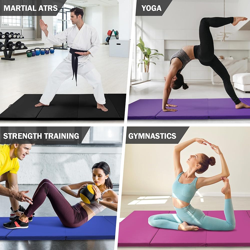 Multi-Sport Versatility: From Yoga to Martial Arts! Designed for all fitness levels, this gymnastics mat supports diverse activities: stretch on its cushioned surface for yoga, practice high-impact exercises such as MMA, tumbling or core training. The folding workout mat's non-slip base keeps it steady on hardwood, tile, or grass