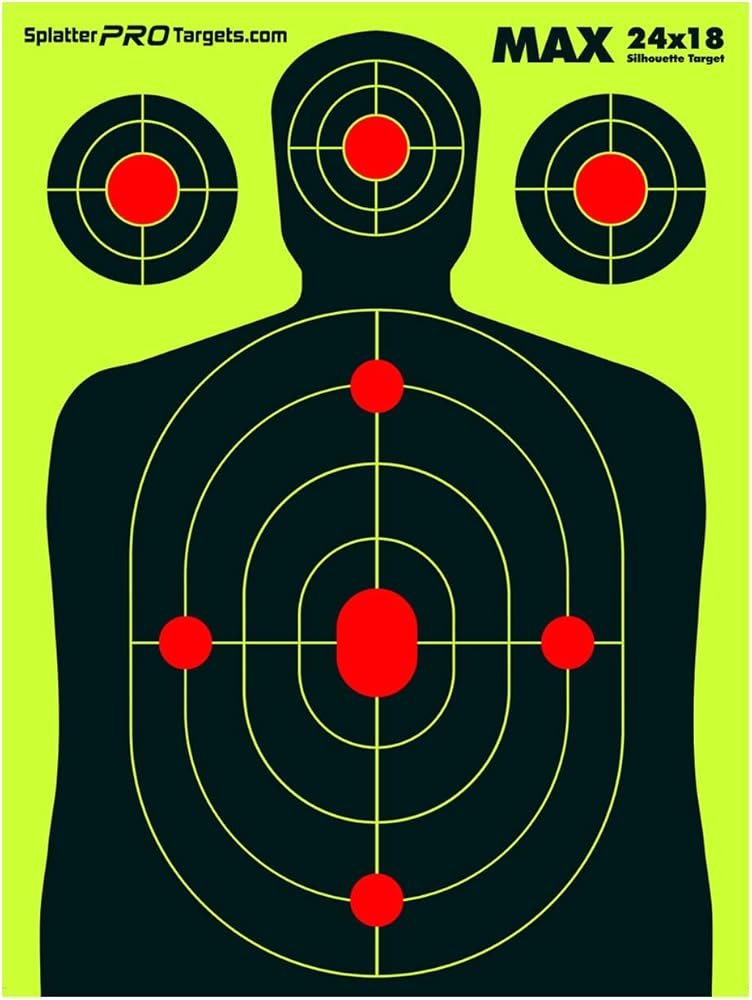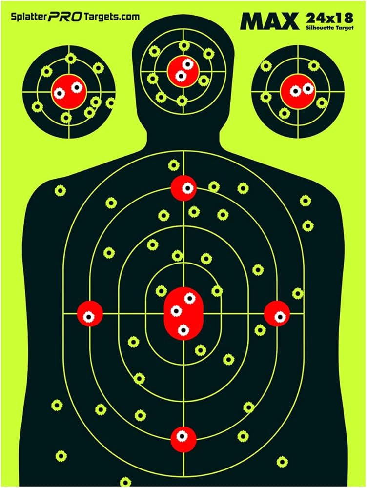 Compare our Splatter Targets to anything on the market. Our targets lay flat and STAY FLAT. If you've ever had a target curl up on you when you're at the range you know how frustrating that can be. Our targets are printed on sturdy 10 pt. board stock, not cheap paper. Our goal was simple. Make the best target on the market and we've done that. The Bright Yellow bullet holes are visible in all light conditions and help you quickly get on target and stay on target. Perfect for air guns, rim fire and center fire rifles and pistols. Our targets work great for sighting in shotguns as well.