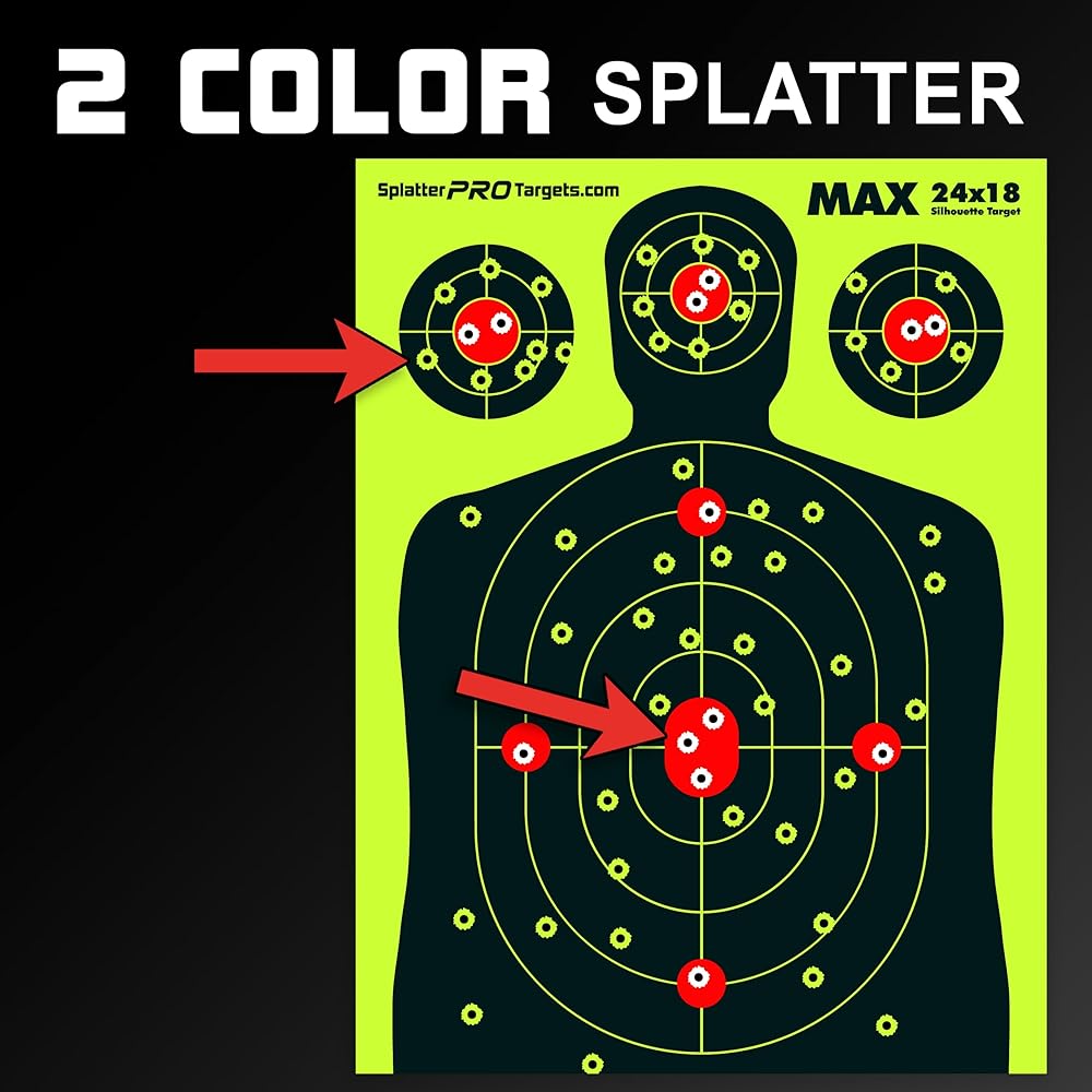 Two Color Splatter! Our HIGH VISIBILITY splatter targets make it EASY to see your shots at a distance, no more wasting time walking downrange to SEE YOUR SHOTS