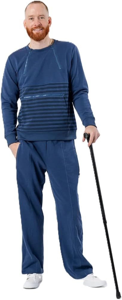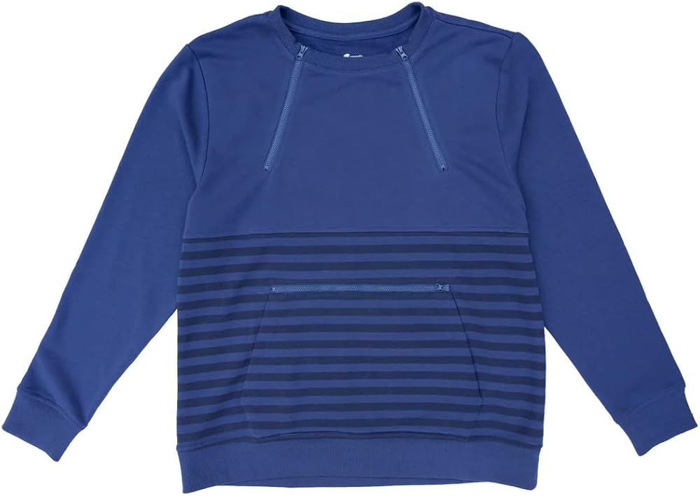 Adult Stripe Zip Access Sweatshirt – Bold Style, Built-In Functionality Designed with both comfort and access in mind, our Adult Stripe Zip Access Sweatshirt features thoughtfully placed zippers and hidden storage—making it a stylish solution for treatment days, post-surgery recovery, or everyday wear. - Made from soft, warm French terry for breathable comfort - Crew neck with two MRI-friendly plastic zippers for discreet bilateral chest port access - Third zipper above the front pocket allows easy abdominal access - Large zippered Spoonie Signature Pocket includes: * An interior pocket for an insulin pump, phone, or other small device * A hidden 4-inch opening with snap closure for tubing, feeding access, or catheter management - Ribbed cuffs and waistband offer a secure and comfortable fit - Features bold contrast stripe detailing on body and pocket A classic pullover silhouette with modern function, this sweatshirt supports your style while delivering discreet clinical access when you need it. Now available in True Navy and Pale Pink, soon in Khaki.