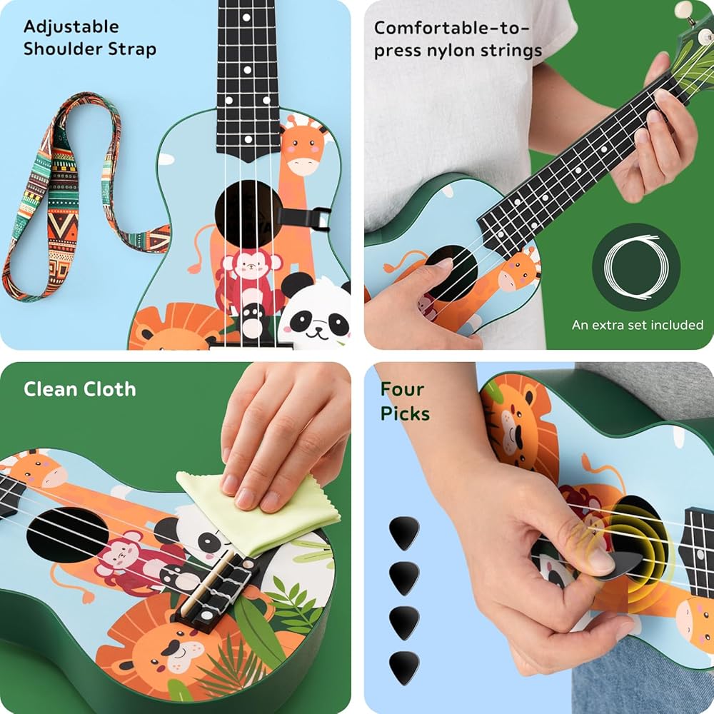 All-in-one Ukulele Beginner Set: To offer a better learning experience, the ukulele comes with shoulder strap,carrying bag, cleaning cloth 4 extra nylon strings and 4 picks. Nylon strings are easier for beginners to play, speeding up the learning process, while the shoulder strap provides a more comfortable playing posture, allowing players to enjoy music for longer periods.