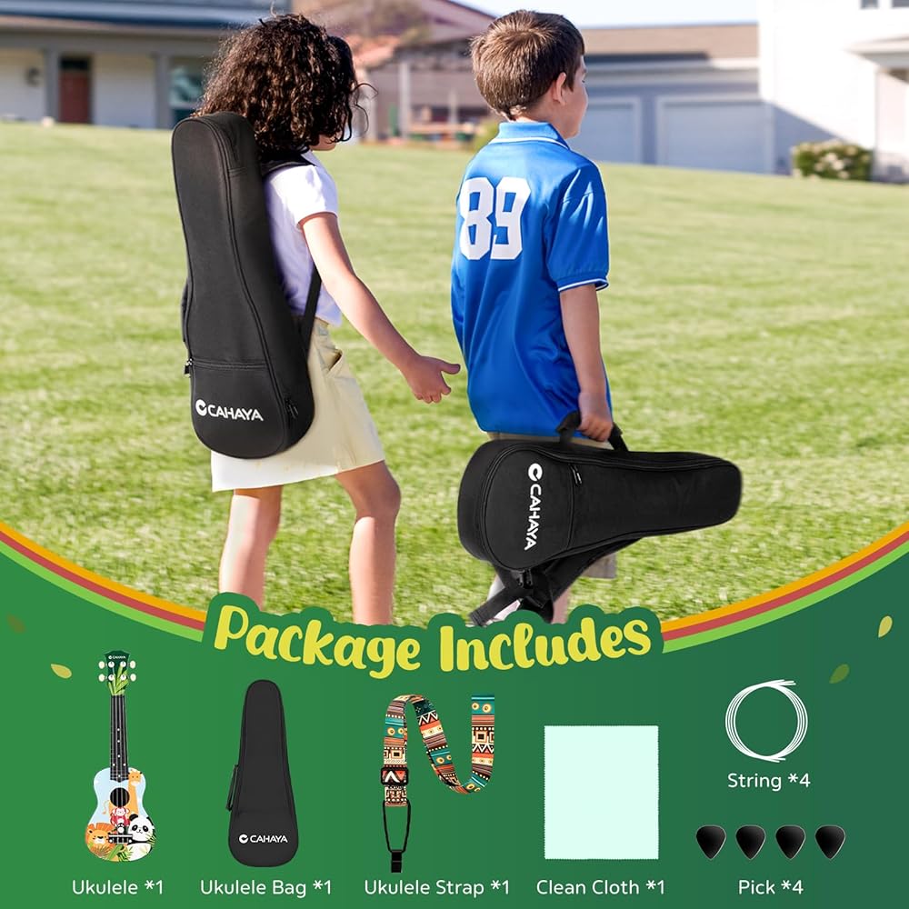 Unique Designed Ukulele:The 21-inch ukulele with exclusive designs by CAHAYA features a unique look and lightweight, easy-to-play build, making it perfect for beginners. It's also an ideal gift, combining practicality and artistry, offering a thoughtful and creative choice for music lovers.