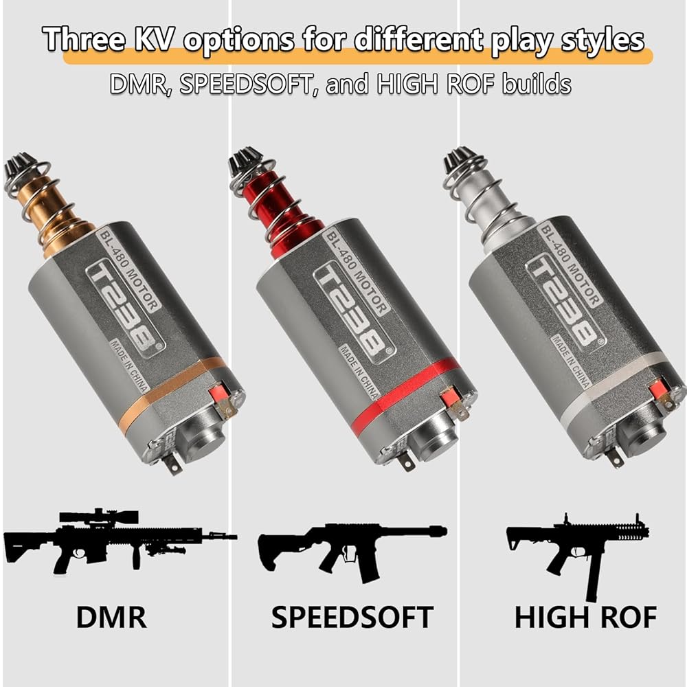 High-Performance Brushless Motor:T238 BL-480 delivers instant trigger response, ultra-high efficiency, and superior durability—perfect for competitive AEG and gel blaster builds like DMR, CQB, and speedsoft.