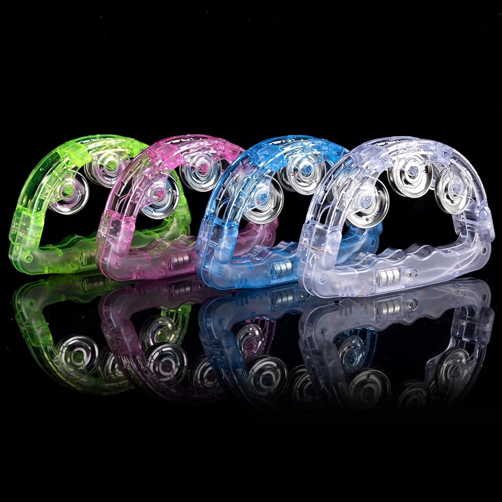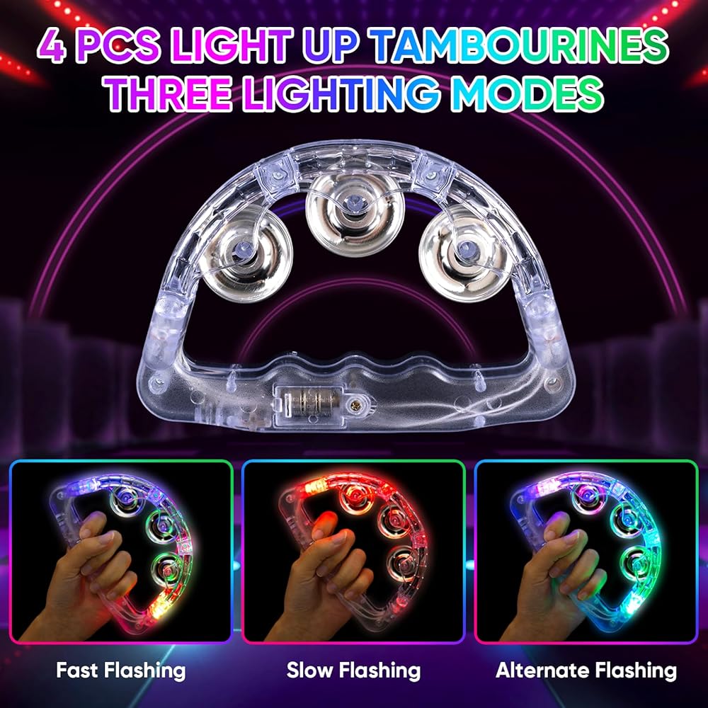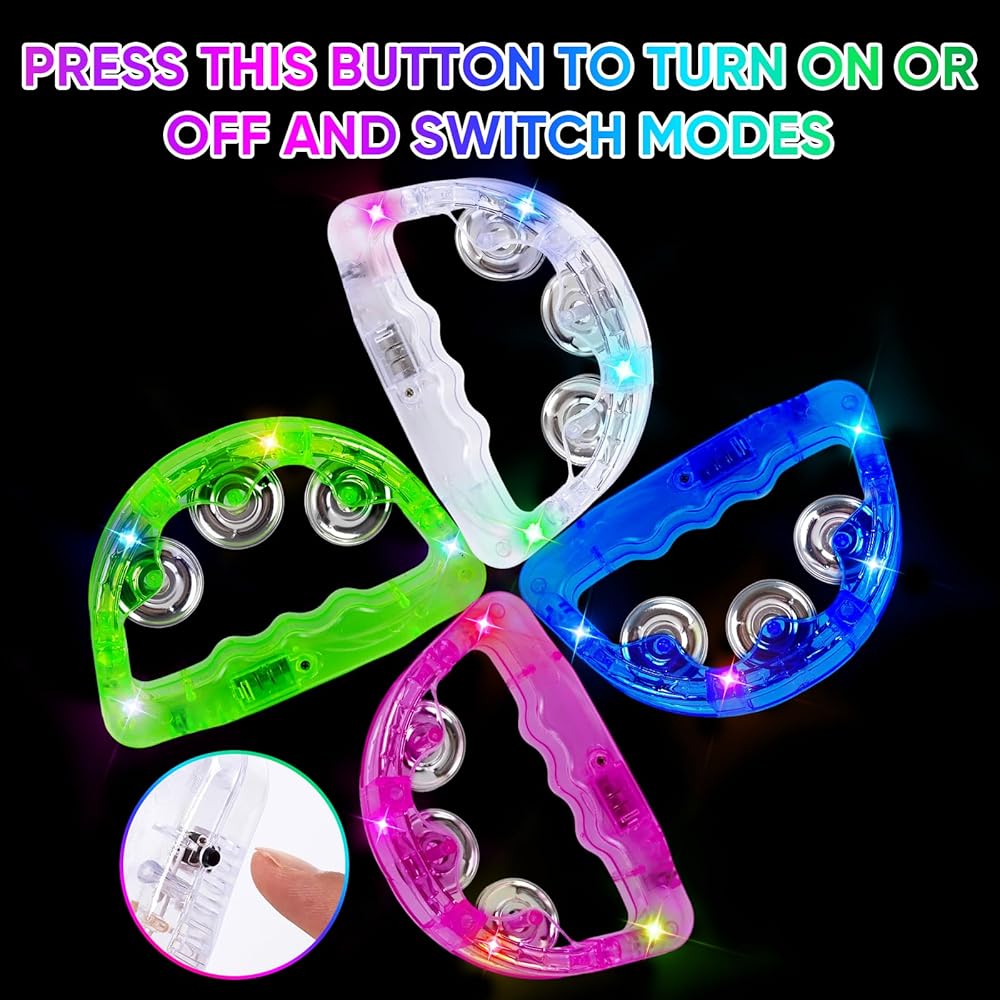 Glow in the Dark Tambourine: You will get 4 pcs Led light up tambourines, each handheld tambourine is equipped with 3 coin cells for longer brighter, you can shake the growing tambourine in the dark to make a clear sound, bring you fun
