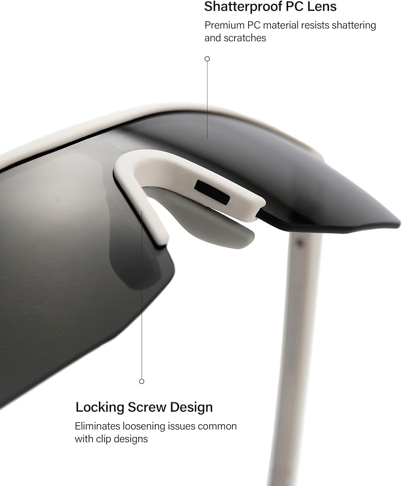 Engineered for Endurance - Built with a reinforced locking screw structure and shatterproof PC lenses, these sport sunglasses offer superior impact resistance. They're your reliable partner for demanding use, providing essential safety and long-lasting durability season after season.