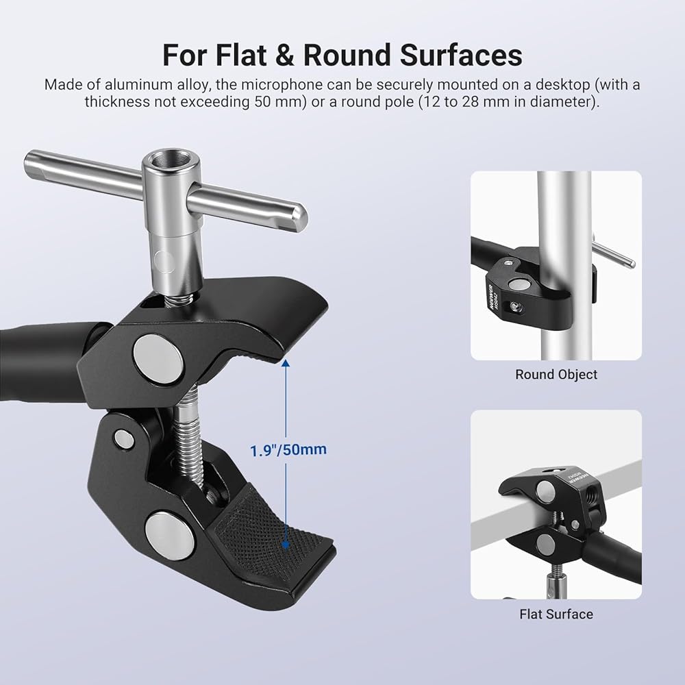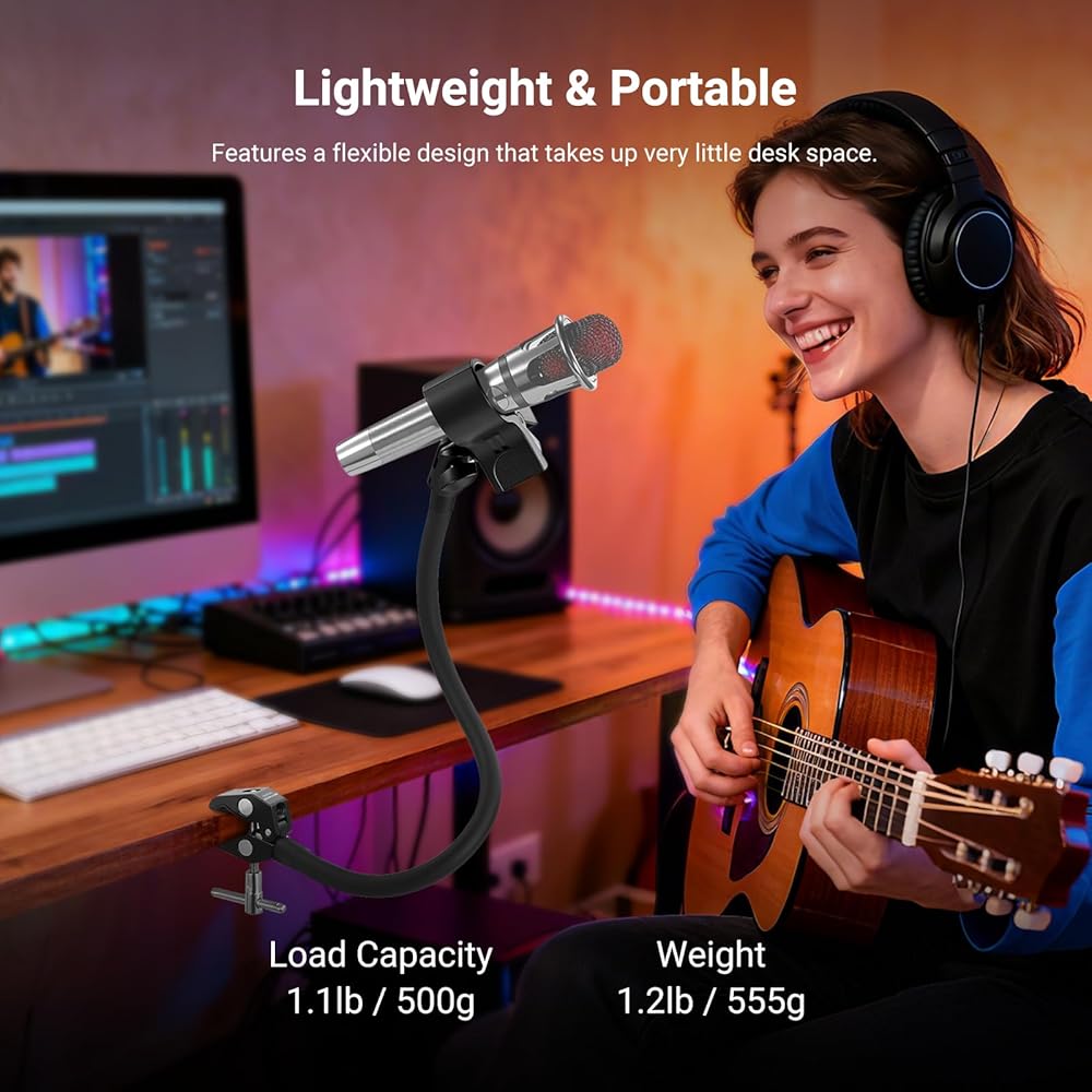【Flexible & Smooth Adjustment】 The 7.9" (20 cm) flexible boom pole arm offers exceptional adaptability, maintaining its shape even when bent, with a 360° rotatable ball head on the top, ensuring your phone stays securely at any desired angle or height. Whether for speeches, meetings, karaoke, on stage singing, band performances, studio recording, or live streams and online classes, the clip phone stand holder is always within reach