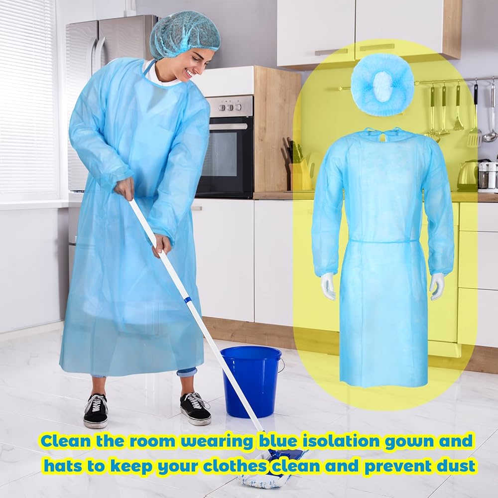 The disposable isolation gown and cap can be applied for laboratory, workplace, tattoo practices, pet grooming, clinics, pharmacies, beauty agencies, food service, kitchen, etc.
